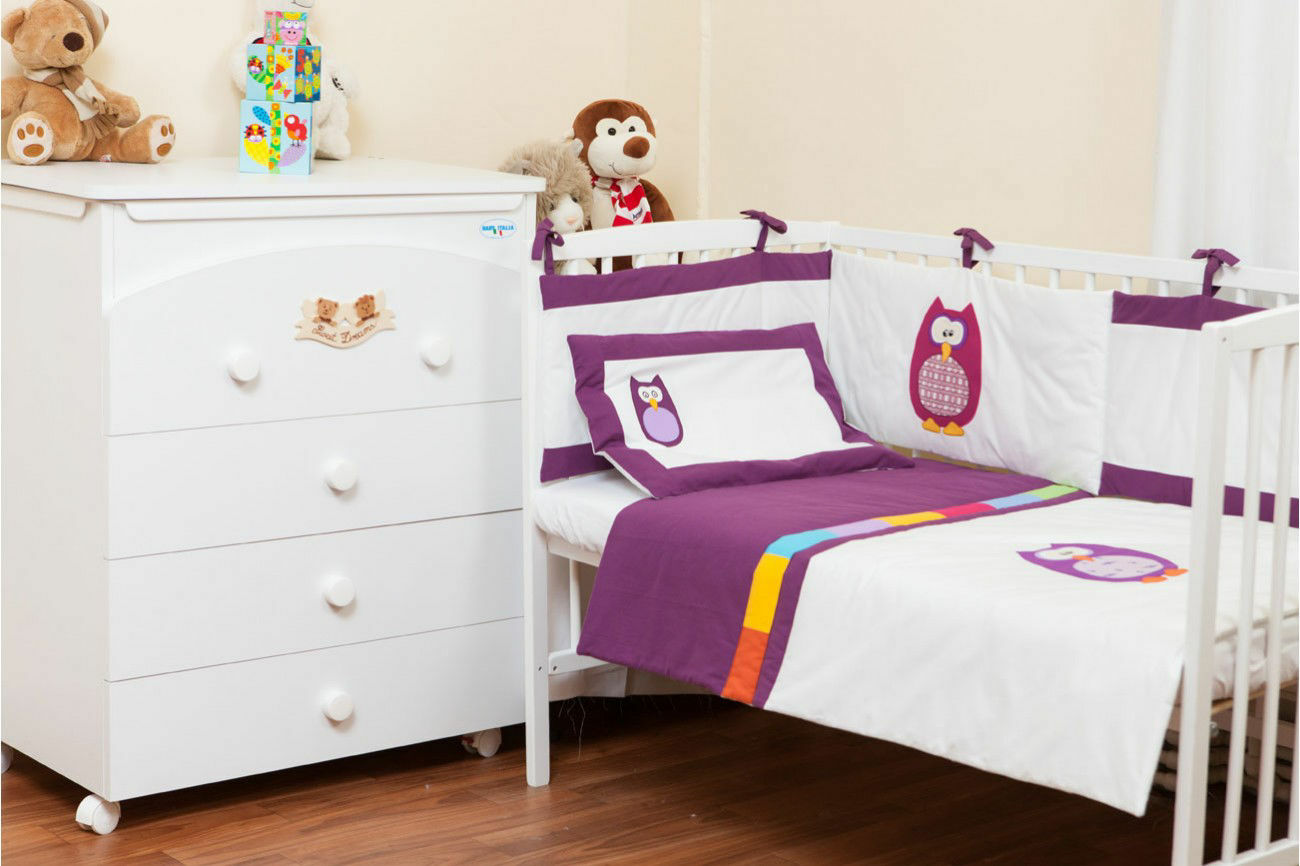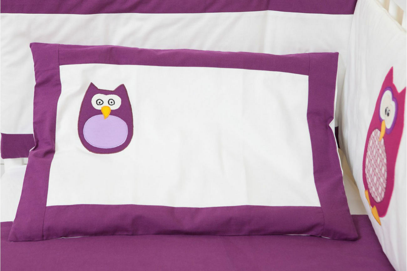 Lenjeria „Bufnite brodate” pentru patut 60 x 120 cm combina eleganta cu simplitatea. Aceasta lenjerie contine tot ce ai nevoie pentru a echipa patutul bebelusului: o fata de pilota, o fata de perna si cearceaful cu elastic pentru saltea.