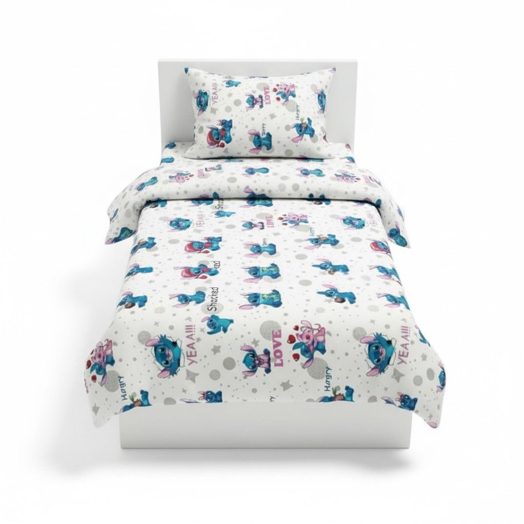 Lenjerie crem pat in 3 piese din bumbac ranforce pentru copii de 2-12 ani, cu design de inspiratie Angel si Stitch , pentru saltea de 160x80cm