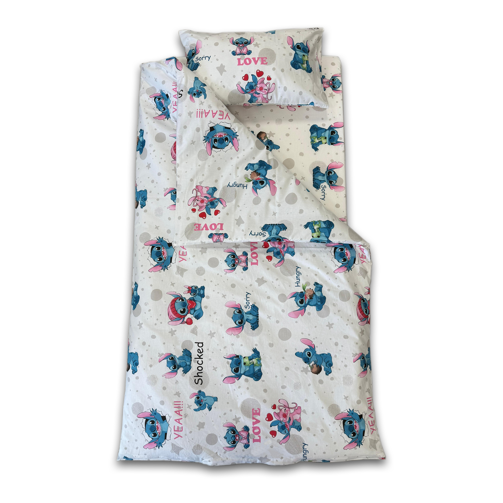 Lenjerie crem pat in 3 piese din bumbac ranforce pentru copii de 2-6 ani, cu design de inspiratie Angel si Stitch , pentru saltea de 130x60cm