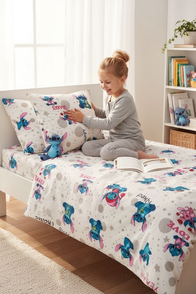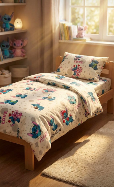 Lenjerie crem pat in 3 piese din bumbac ranforce pentru copii de 2-8 ani, cu design de inspiratie Angel si Stitch , pentru saltea de 140x70cm
