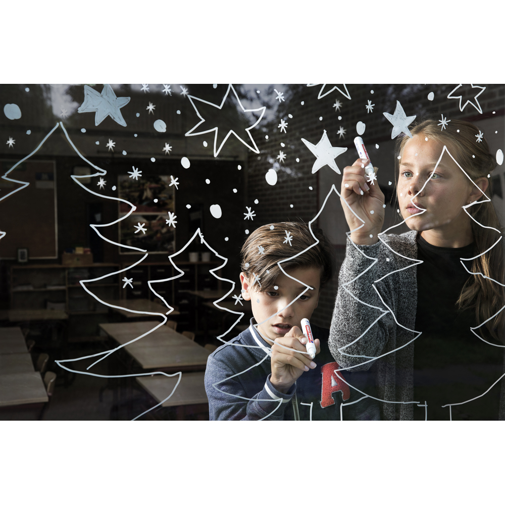 Transforma-ti creativitatea in proiecte spectaculoase cu markerul de creta lichida edding. Special conceput pentru a desena, decora si scrie in mod nepermanent pe suprafete neporoase, precum ferestre, table negre, sticla, plexiglas® si oglinzi, acest marker este instrumentul ideal pentru a adauga o nota artistica oriunde doresti.