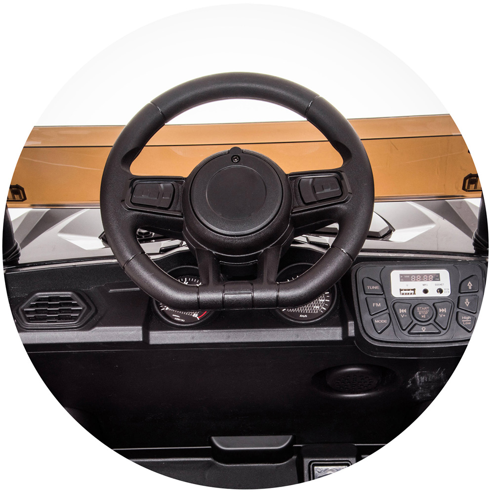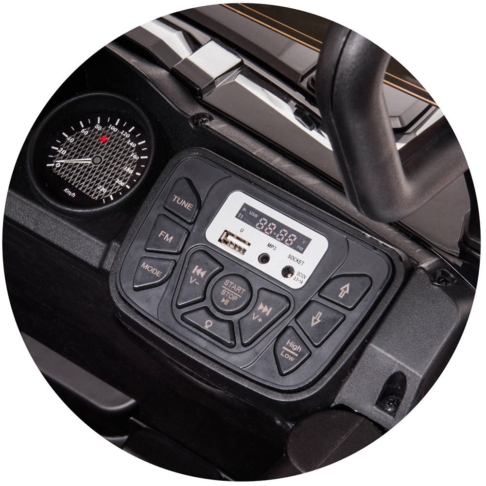 - Pentru o distractie si mai mare masina dispune de o intrare USB sau AUX la care se poate conecta orice sursa MP3, iar exista si functia de radio FM