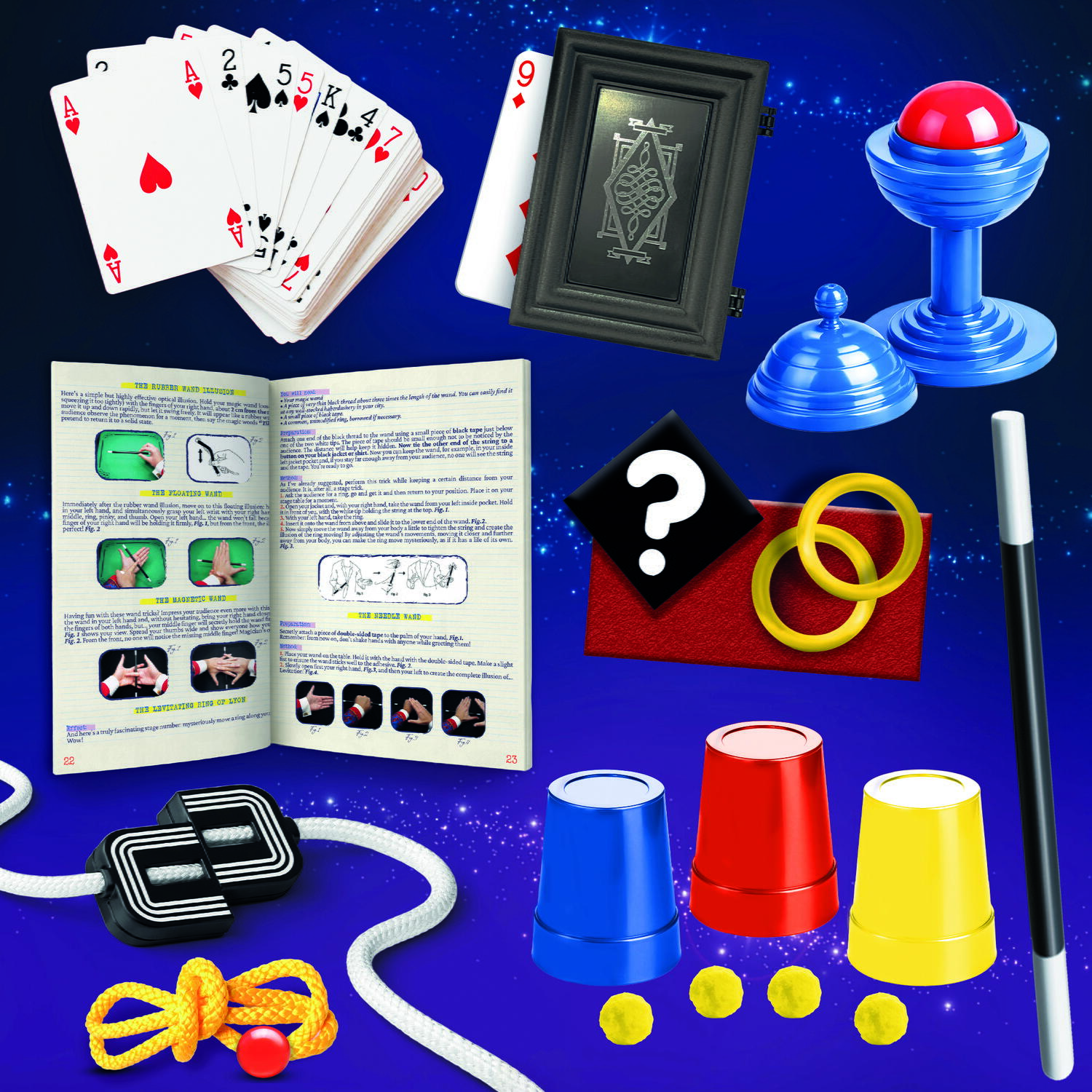 - vei putea pune in practica 80 de trucuri, spre exemplu: diferite trucuri cu carti de joc, trucul cu cartea lui Brachetti (magician cunoscut), trucuri cu carti de joc si cutia neagra magica, trucuri cu cuvinte care apar si dispar,, mentalism, trucuri cu pahare si zaruri, trucuri cu sfoara, iluzii optice, truc cu vaza si bila si altele