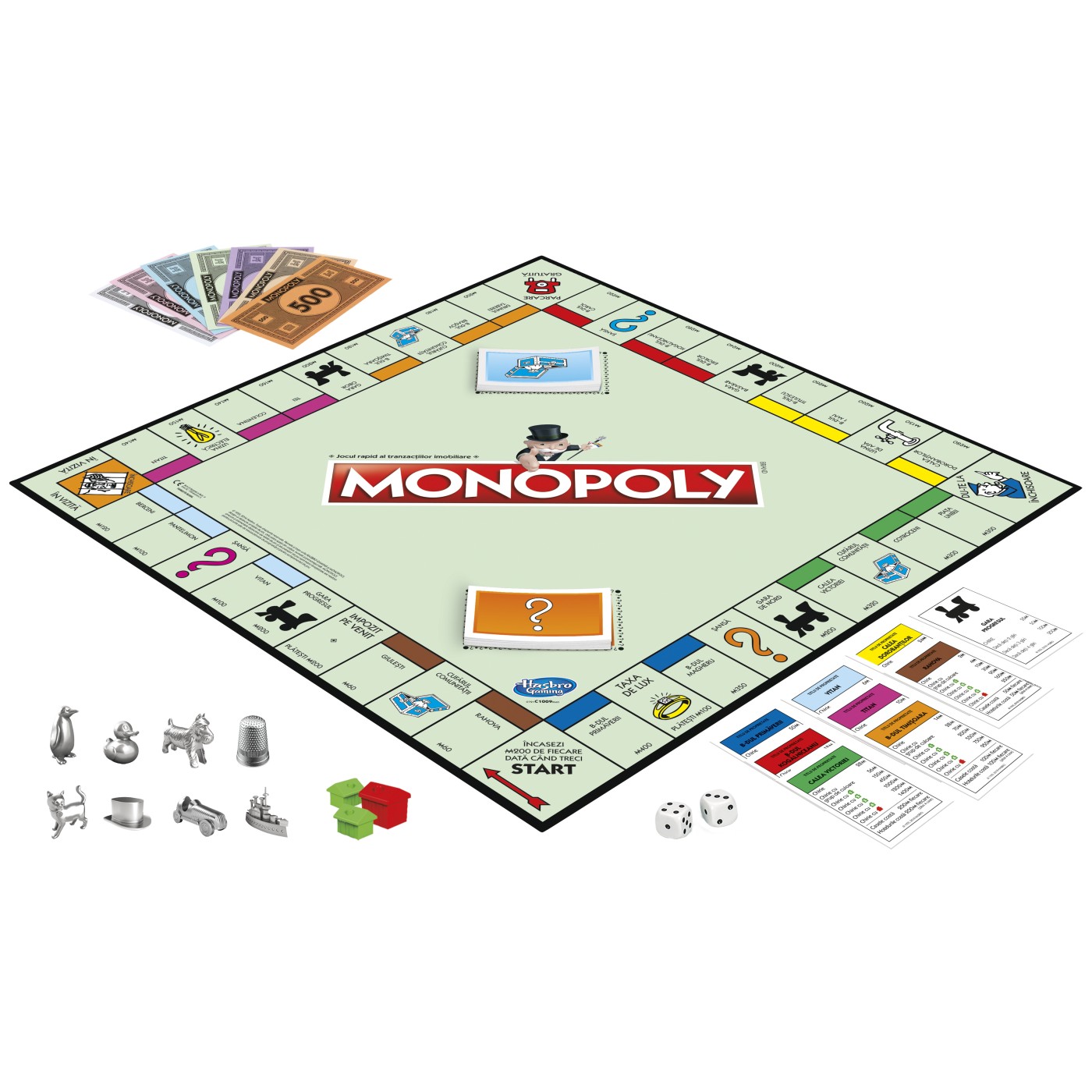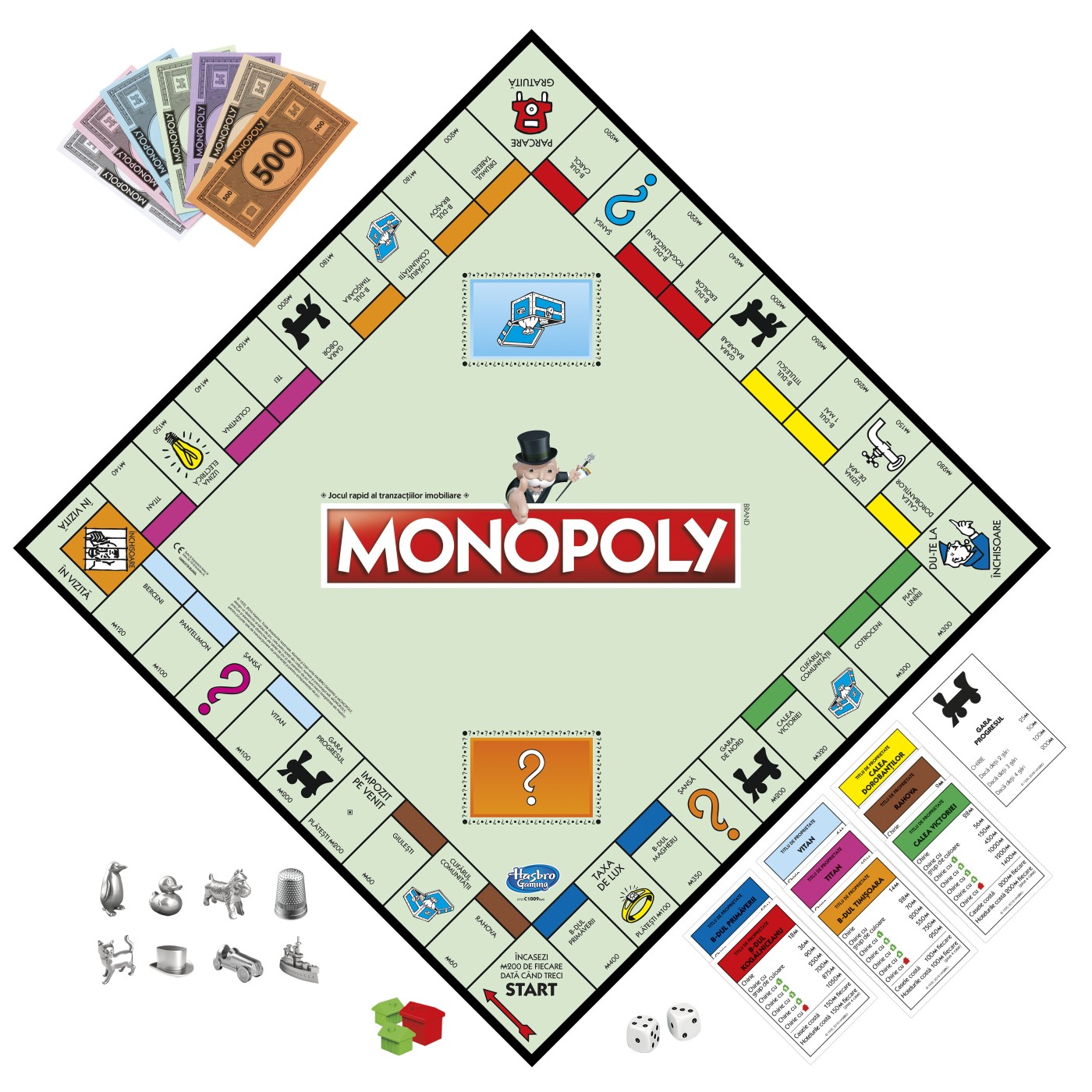 Monopoly- O noua colectie de pioni este un joc de societate care te invata, prin joc, cum sa iti administrezi banii. Descopera cel mai faimos joc de tranzactii imobiliare, in varianta clasica, cu strazile din Bucuresti si cu trei noi pioni Ratusca, Pinguinul si Dinozaurul T-Rex. Alege-ti pionul preferat, misca-te pe tabla, vinde si cumpara proprietati si construieste case si hoteluri din mers. Scopul e sa faci tranzactii profitabile si sa te imbogatesti rapid - in curand vei detine totul! Jocul contine 1 tabla de joc, 8 pioni, 28 cartonase - Titluri de proprietate, 16 cartonase - Sansa, 16 cartonase - Cufarul comunitatii, 32 Case, 12 hoteluri, 2 zaruri, pachet de bani, regulament de joc. Noua versiune te intampina cu noi pioni simpatici!