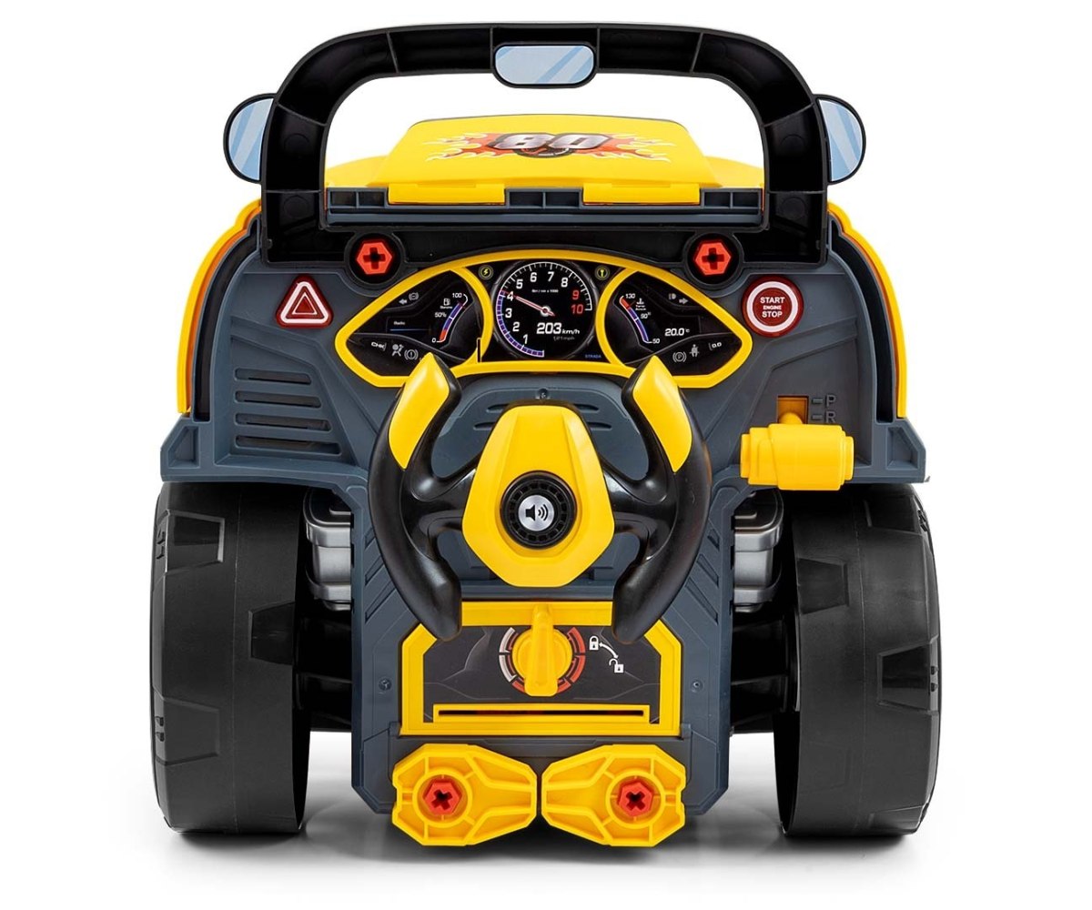 Jucaria este dotata cu efecte sonore si luminoase care adauga emotie si realism jocului. Datorita setului de unelte si pieselor mobile, copilul poate repara masina, schimba rotile, strange suruburi si invata bazele mecanicii prin actiune. Astfel, isi dezvolta abilitatile manuale, gandirea logica si invata prin joaca.