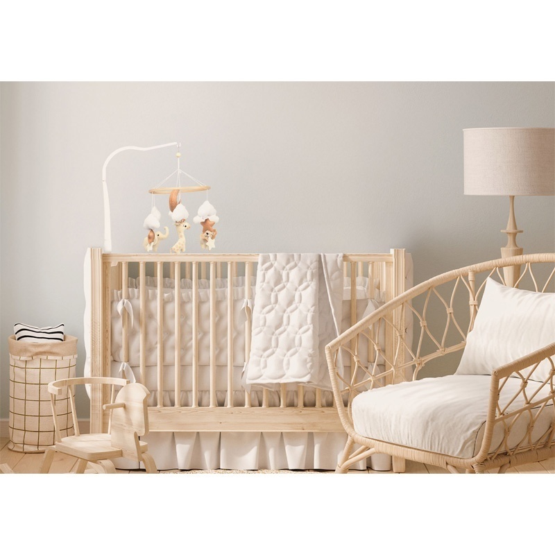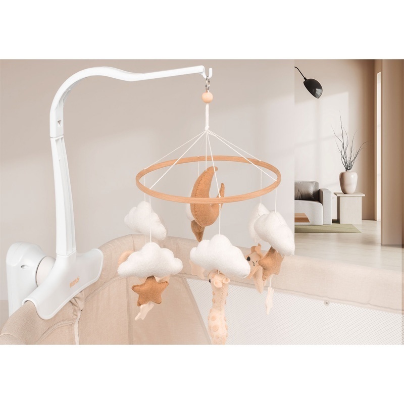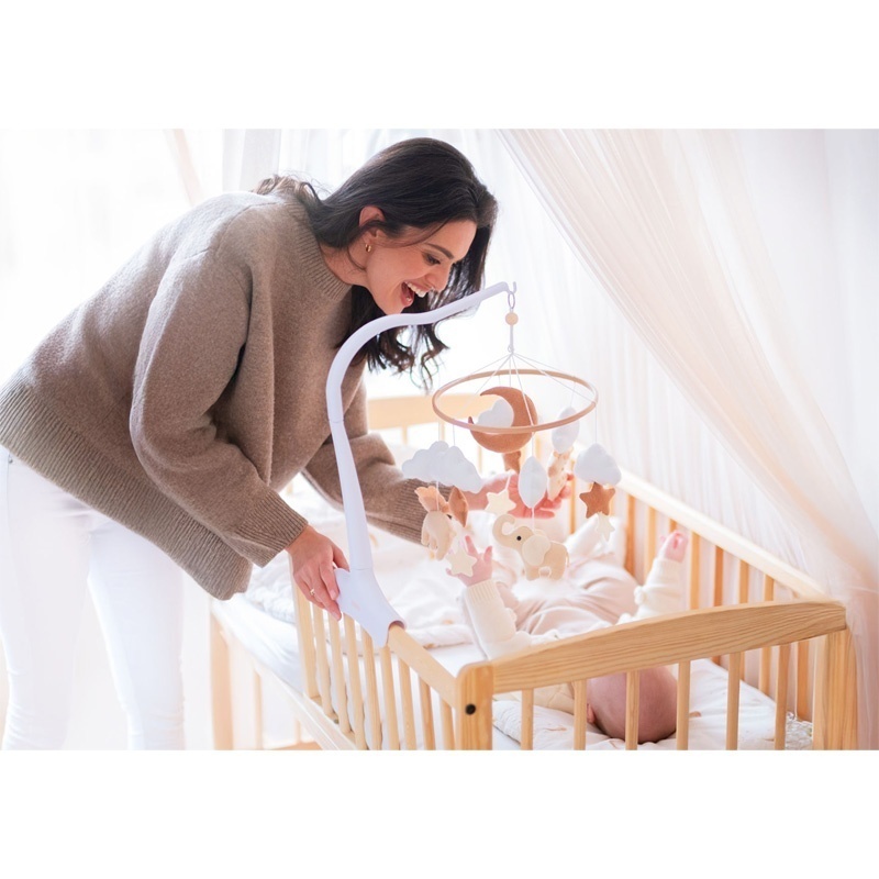Caruselul se montează rapid, fără unelte suplimentare. Suportul de prindere inclus este robust și bine proiectat, fiind compatibil cu majoritatea pătuțurilor și asigurând o utilizare zilnică sigură.