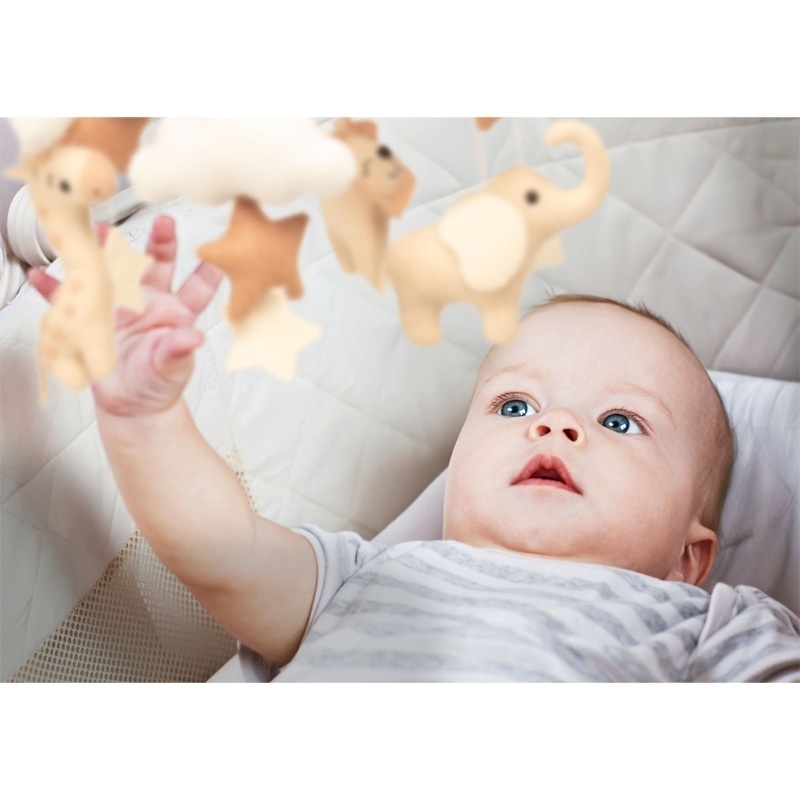 Elementele suspendate se mișcă ușor, atrăgând atenția bebelușului și ajutându-l să își dezvolte capacitatea de a urmări mișcarea, de a distinge formele și culorile încă din primele luni de viață.