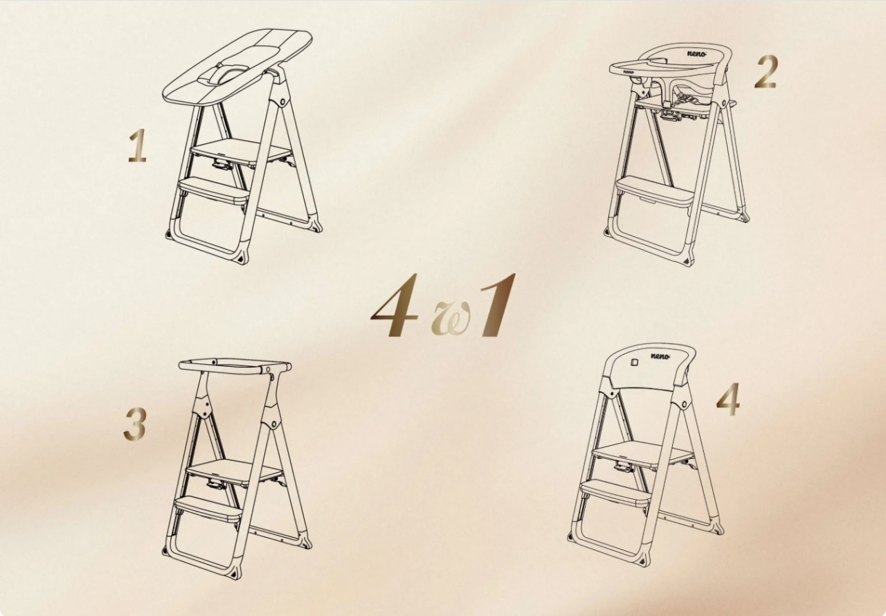 Neno Sapori Black este un scaun premium 4 în 1, conceput pentru a crește odată cu copilul tău și a-l însoți de la primele luni de viață până la vârsta adultă. Datorită designului inteligent și construcției solide, poate fi utilizat ca leagăn înalt pentru bebeluși, scaun de hrănire, ajutor de bucătărie și scaun pentru adulți.
