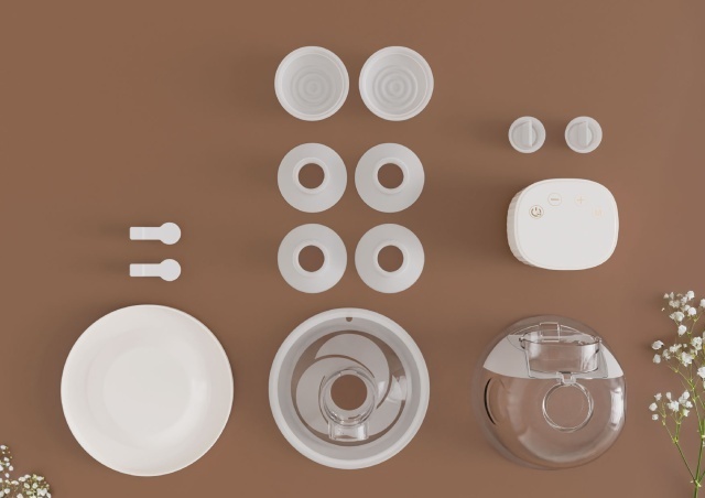 Tot ce ai nevoie se află într-o singură cutie: dispozitivul de pompare, pâlnie din silicon de 25 mm, patru inele de reducție, membrane, supape, recipient tip scoică cu capacitate de 150 ml și cablu USB-C. Un set gândit cu grijă pentru confortul tău!