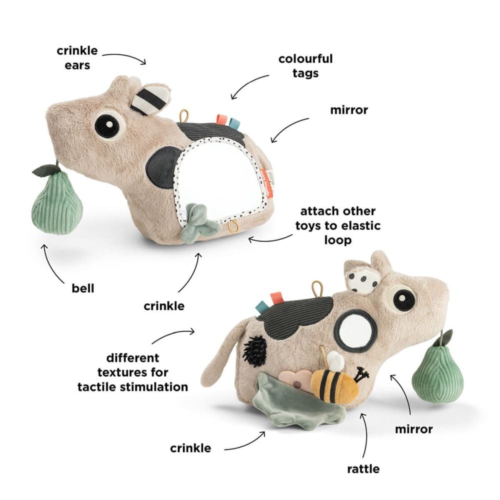 'Jucaria include mai multe detalii care mentin interesul copilului si sustin stimularea senzoriala. Sunetele delicate, texturile crinkly si etichetele colorate invita la atingere, apucare si observare. Oglinda contribuie si la aparitia timpurie a curiozitatii fata de propria reflexie, ceea ce adauga un plus de valoare in joaca zilnica.