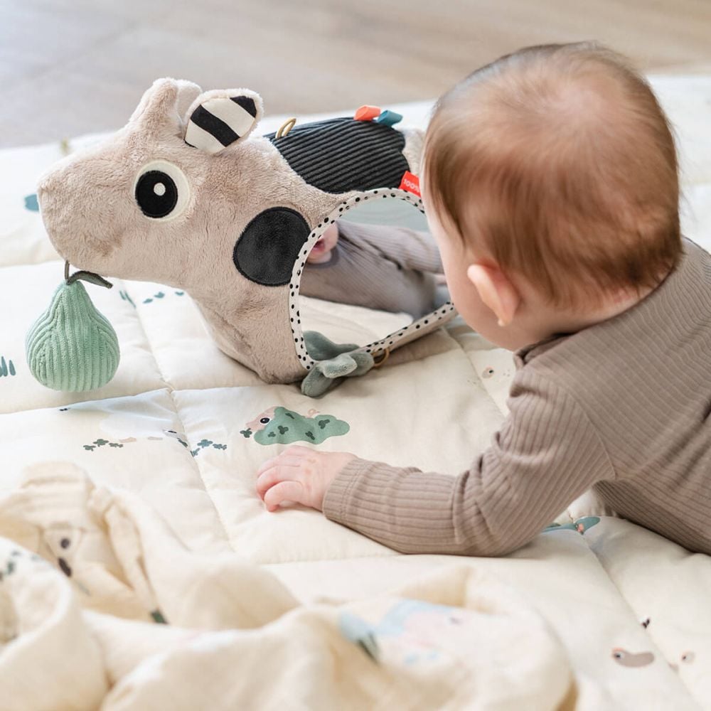 'Acest model sustine joaca timpurie prin activitati simple si naturale. In timpul tummy time, copilul este incurajat sa ridice capul, sa se intinda spre jucarie si sa urmareasca ceea ce vede in oglinda. Acest tip de interactiune ajuta la dezvoltarea coordonarii, a constientizarii corpului si a interesului pentru explorare. Oglinda cu activitati Done by Deer Dotti Sand transforma timpul petrecut pe burtica intr-o experienta mai atractiva si mai variata.