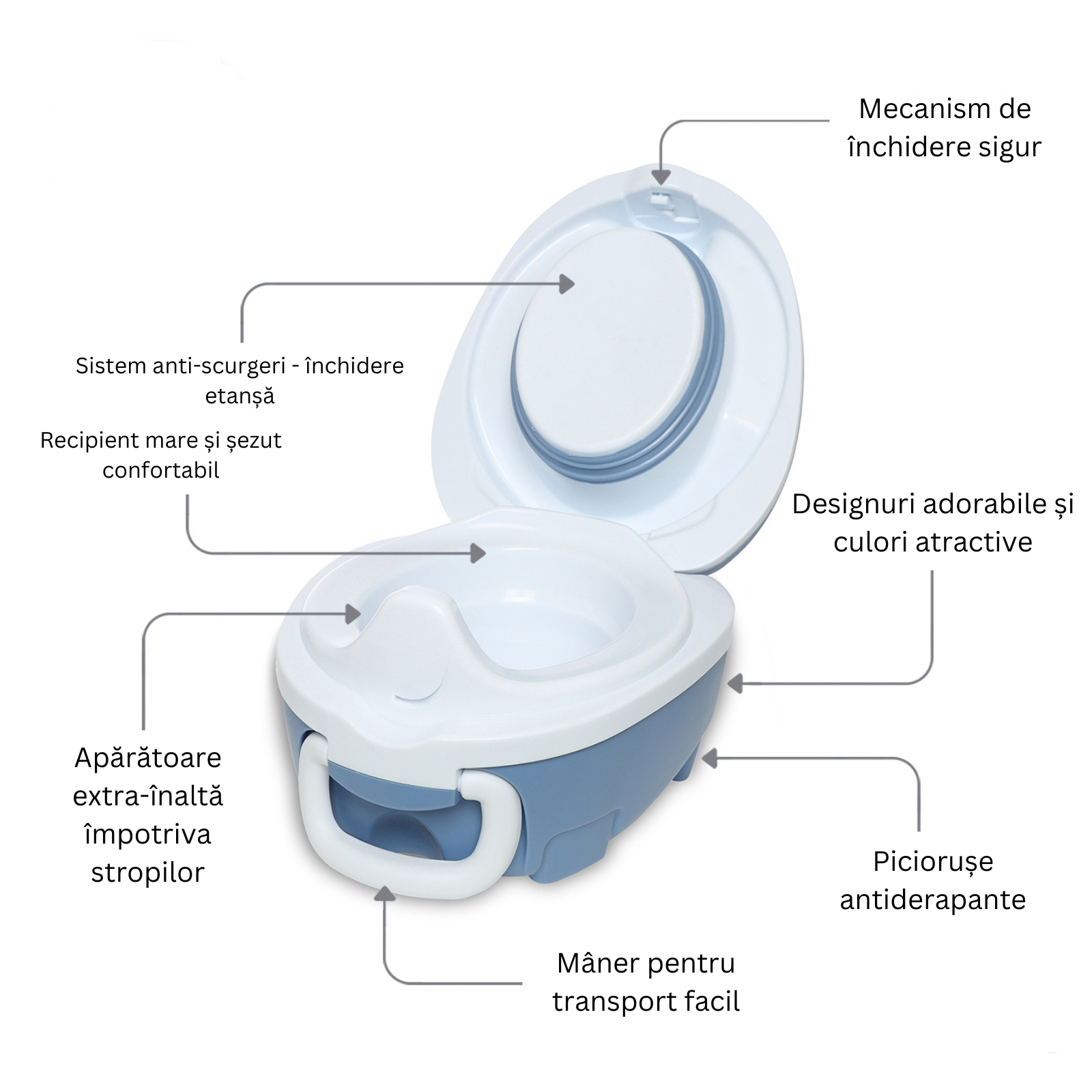 Olita portabila cu capac si maner My Carry Potty in nuanta Bleu pastel este preferata de peste un milion de parinti din intreaga lume. Experimenteaza cea mai bine vanduta olita din Marea Britanie si transforma procesul de renuntare la scutec intr-unul mai usor si mai placut. Designul revolutionar, castigator a numeroase premii, asigura un antrenament la olita fara stres, oriunde si oricand. Aceasta olita poate sustine pana la 350 ml de lichid, pana la linia maxima din vas, si are o limita de greutate de maxim 50 kg. Pentru curatare, nu este recomandat sa scufundati olita in apa sau sa o curatati sub jet puternic de apa, ci pur si simplu sa pulverizati un detergent antibacterian delicat si sa stergeti cu o laveta. Este important de retinut ca nu trebuie folosit clor. Dimensiunile olitei sunt: inaltimea sezutului - 110 mm, latimea sezutului - 200 mm, adancimea sezutului din fata pana in spate - 185 mm, iar greutatea este de 850 grame. Realizata din plastic de inalta calitate, olita portabila My Carry Potty este alegerea perfecta pentru nevoile tale si ale copilului tau.