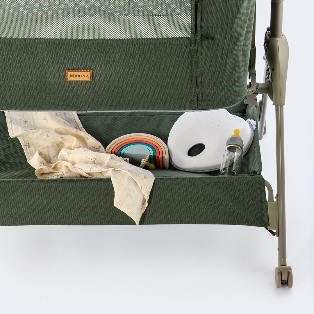 ONINO HOLD.me poate fi folosit ca patut independent, ca patut lateral co-sleeper atasat de pat sau ca patut leagan astfel incat sa gasiti mereu varianta potrivita pentru voi si pentru bebelus. Realizat din materiale rezistente si prevazut cu o salteluta ferma, patutul ofera micutului o pozitie corecta si confortabila in timpul somnului. Mai mult, datorita sistemului de ajustare pe inaltime, se potriveste usor la diferite tipuri de paturi, oferind mereu apropierea de care aveti nevoie. Iar pentru noptile pline de momente imprevizibile, compartimentul de depozitare integrat va ajuta sa pastrati la indemana jucarioarele, paturica de infasat sau alte lucrusoare esentiale. ONINO HOLD.me este un sprijin pentru parinti si un cuib de siguranta si confort pentru cel mic.