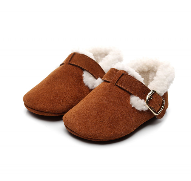 Pantofiori imblaniti pentru fetite din material tip piele intoarsa, se inchid cu catarama intr-o parte.