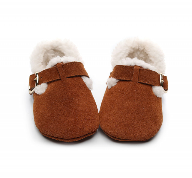 Pantofiori imblaniti pentru fetite din material tip piele intoarsa, se inchid cu catarama intr-o parte.