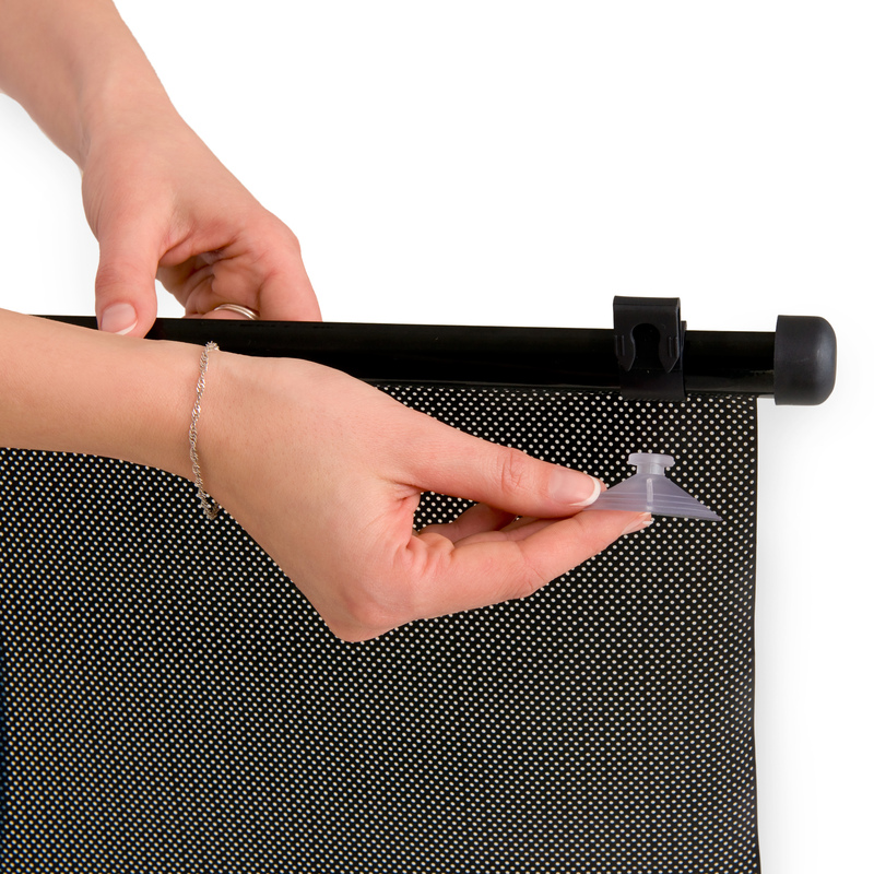 - Metode de Fixare Multiple: Parasolarul poate fi atasat la geamul masinii fie prin intermediul celor doua cleme care se fixeaza direct pe geamul vehiculului, fie prin ventuze extra puternice care se prind pe suprafata geamului. Aceasta versatilitate in metodele de fixare asigura o montare sigura si stabila.