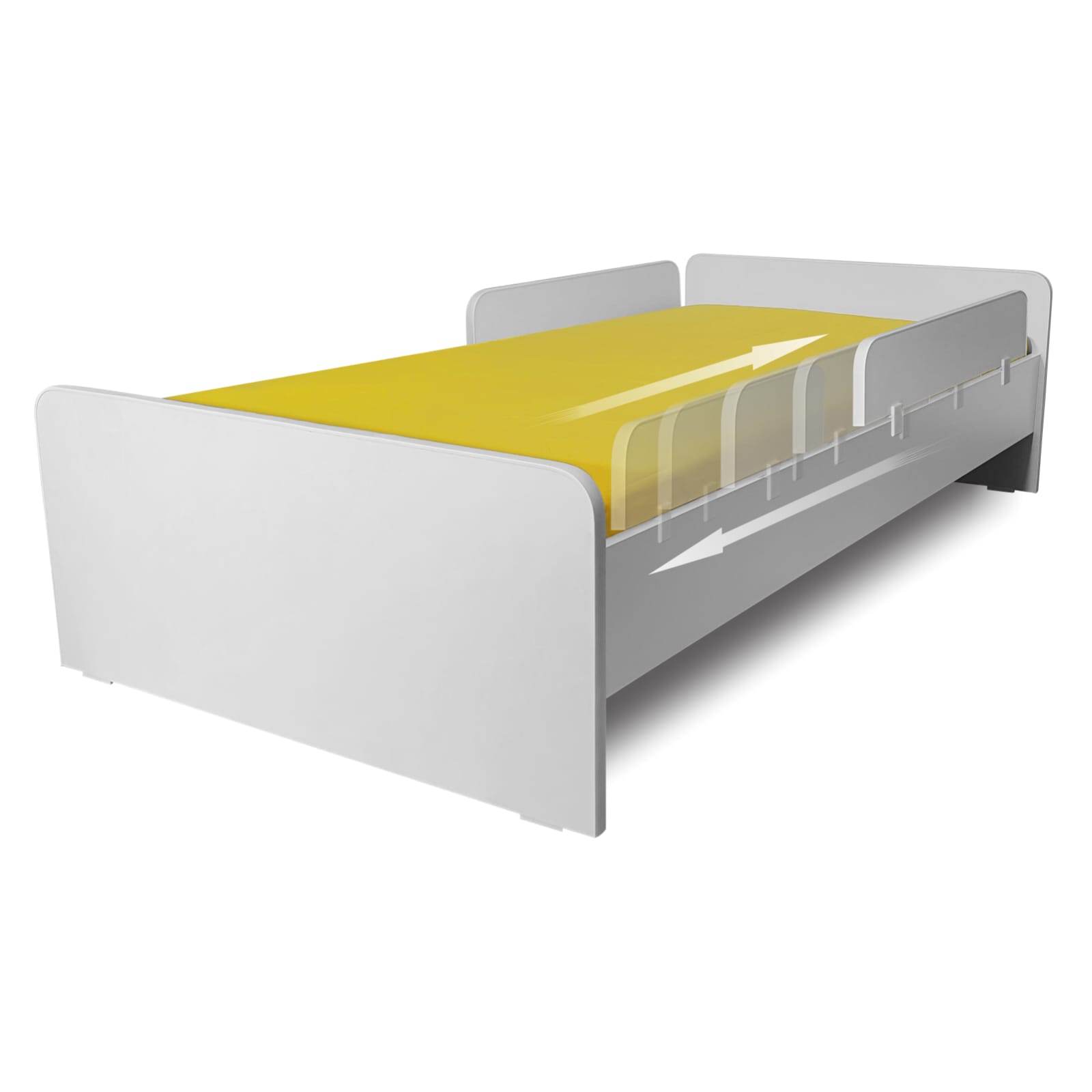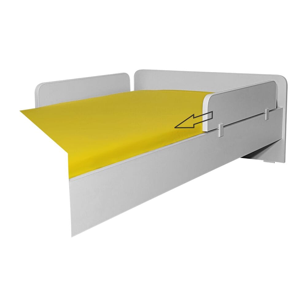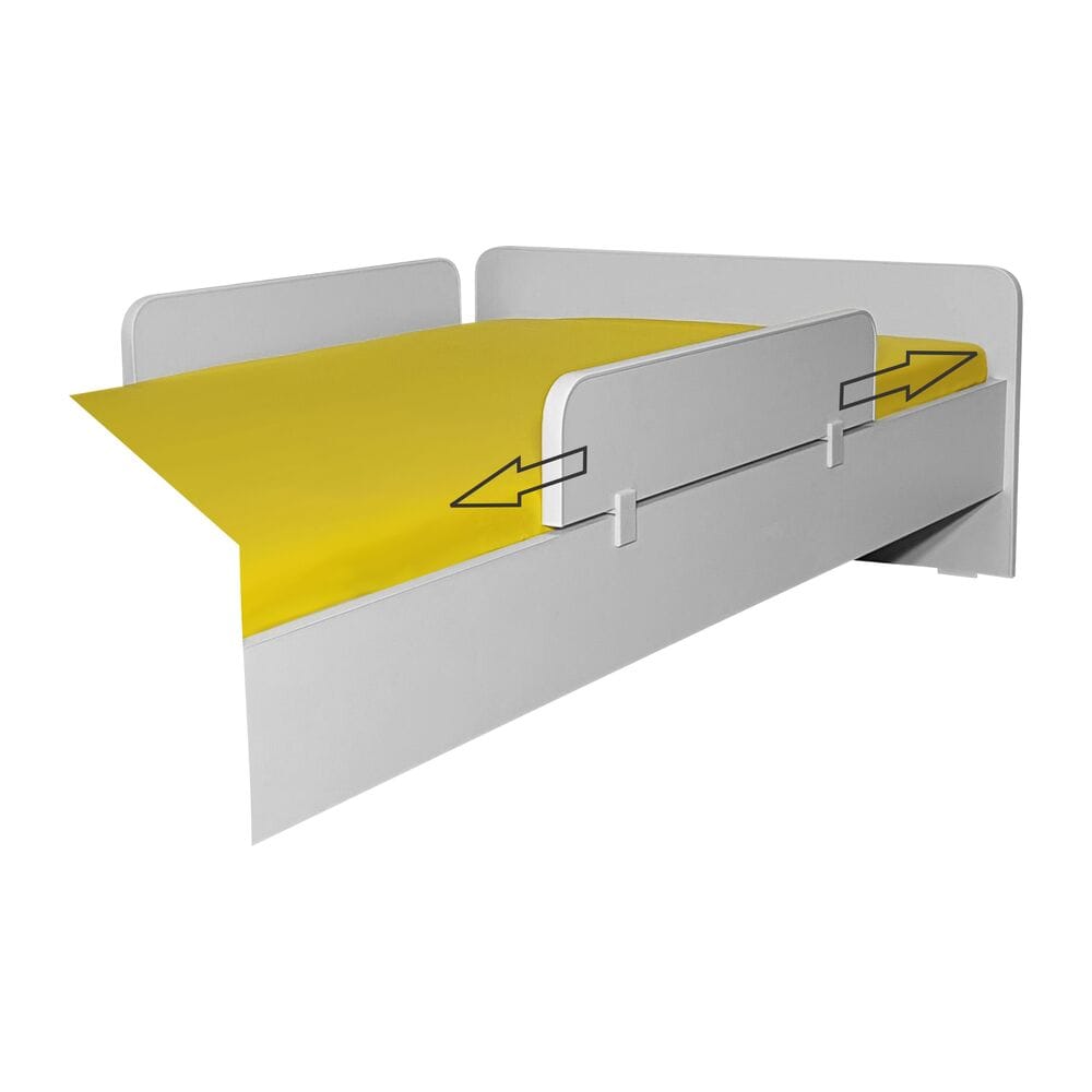 Protectia laterala este prevazuta cu un sistem de prindere format din 2 cleme rezistente, confectionate din material non-toxic (PLA). Poate fi atasat/detasat, pozitionat si repozitionat in orice zona a lateralei patului astfel incat copilul sa fie mereu in siguranta.