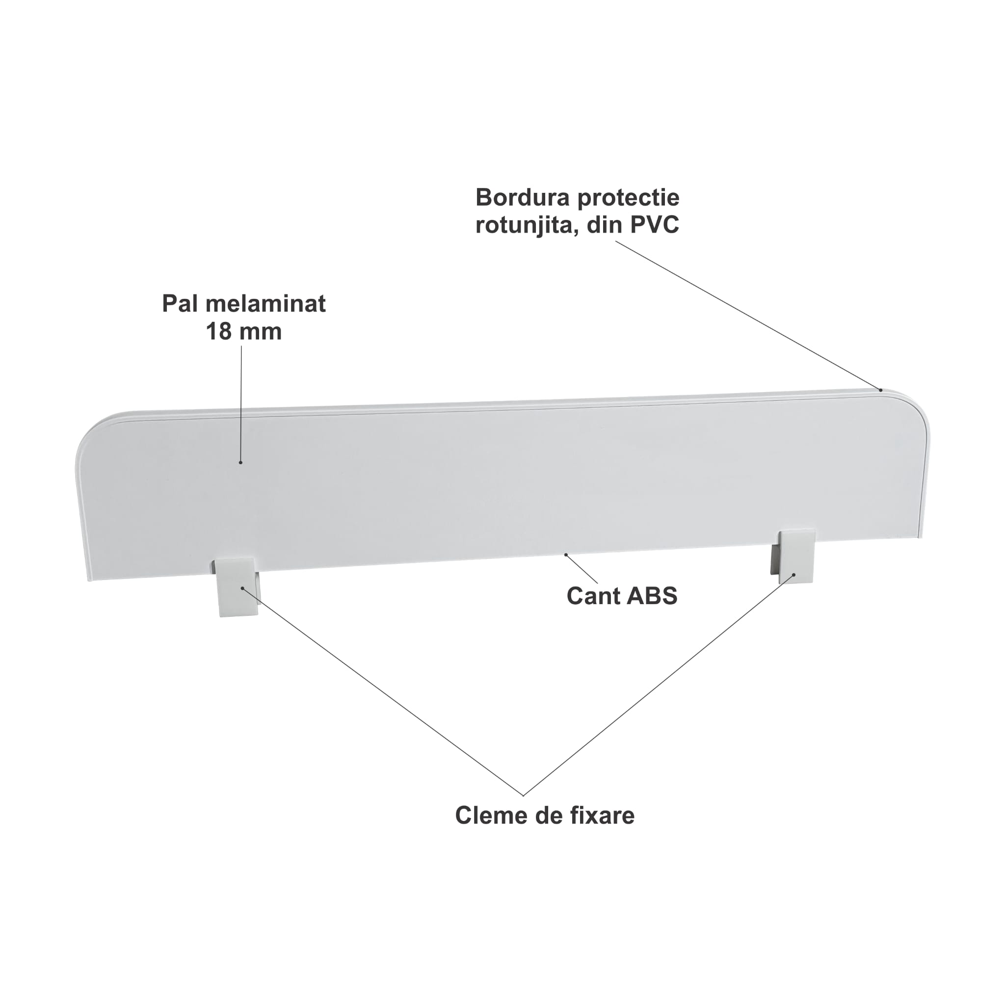 Pal melaminat 18 mm, cant ABS de 2 mm sau 0,4 mm, bordura PVC de protectie, 2 cleme de fixare pe laterala patului.