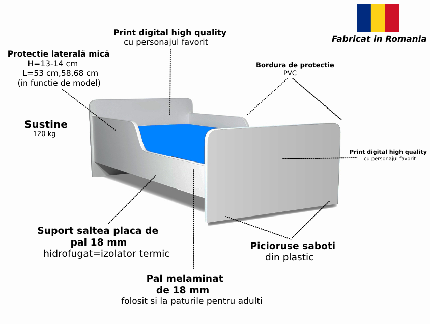 - Dimensionare fixa pentru varianta 130x60 cm (2-6 ani)