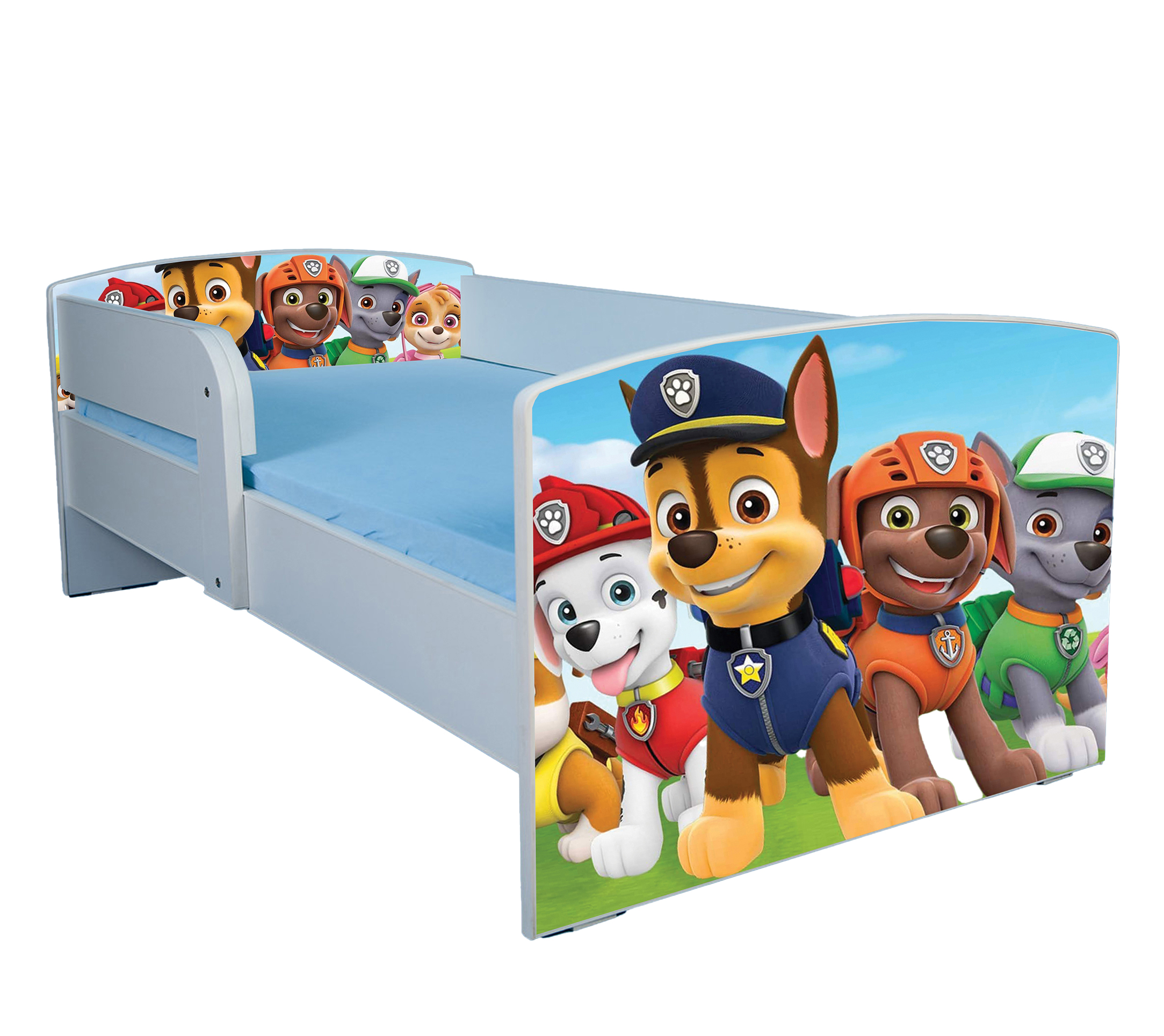 Pat comanda speciala pentru copii cu varste de pana la 12 ani, cu dimensiunea 160X84 cm pentru saltea SafeNest 156x80x6 cm cu imprimeu inspirat Patrula Catelusilor laminat pe capete, fara saltea.