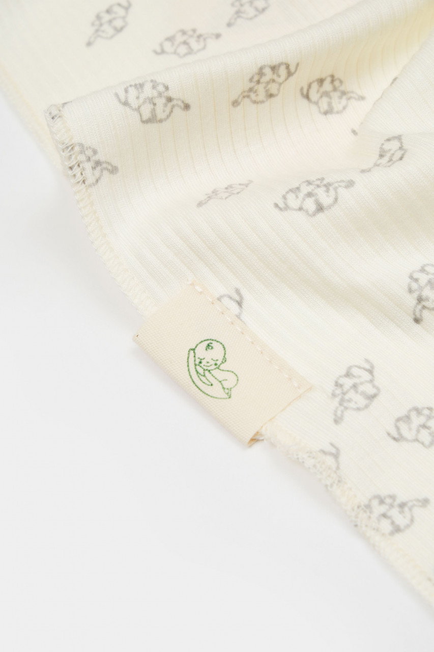 - Este realizat din 50% modal+50% bumbac - material certificat GOTS, delicat cu pielea gingasa a a bebelusului. Printurile sunt cu vopseluri pe baza de apa si toate produsele sunt in concordanta cu standardele GOTS.