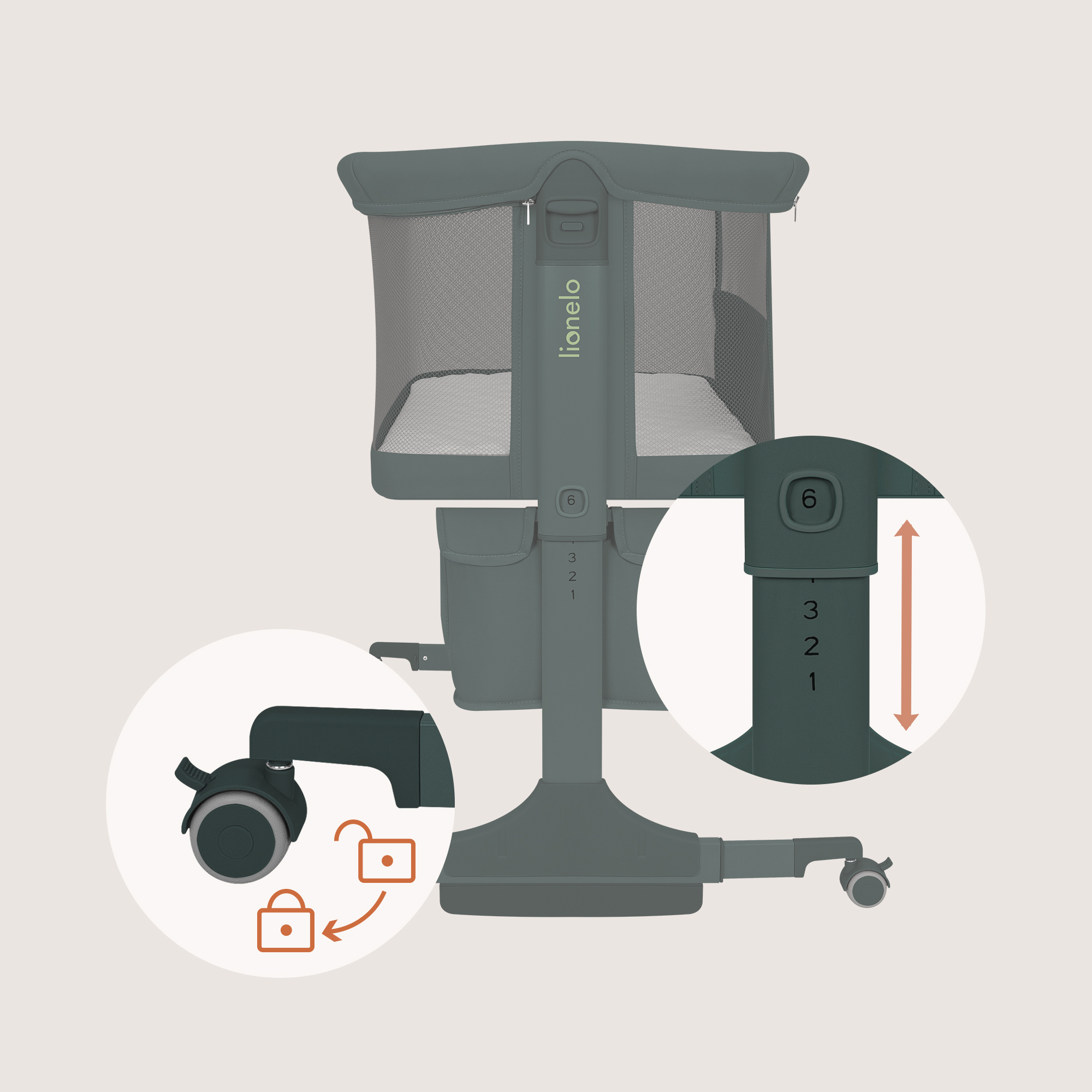 Cele 6 niveluri de inaltime si picioarele reglabile permit alinierea perfecta la patul parintilor, inclusiv la paturi inalte. In plus, ajuta la manipularea usoara fara efort pentru spate.