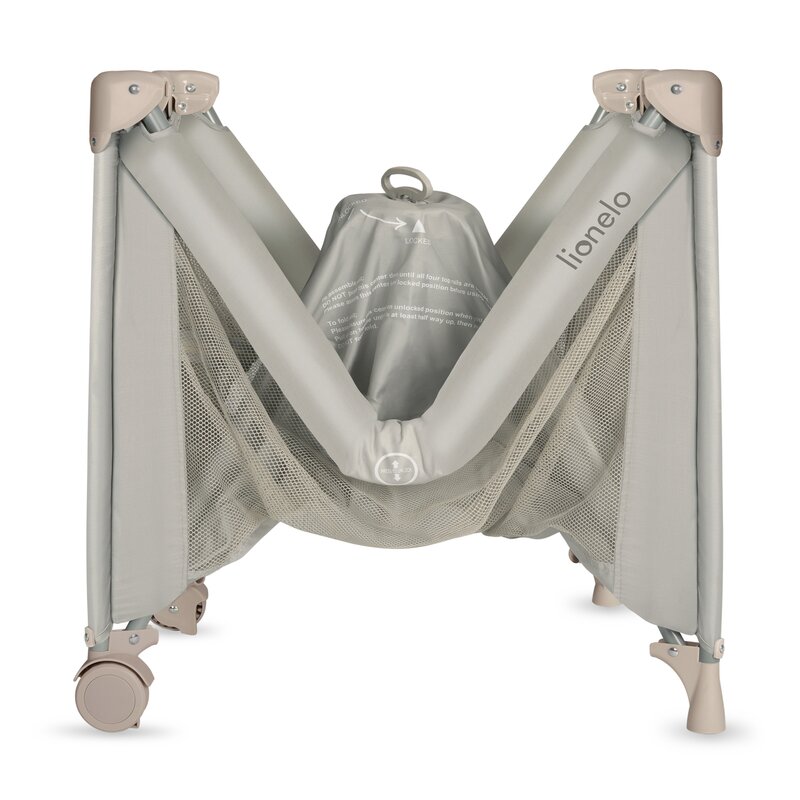 Patutul Lionelo Amelie se pliaza usor, iar odata pliat ocupa foarte putin spatiu – aproximativ 19,5 x 19,5 x 71 cm. Poate fi depozitat simplu in dulap, in portbagaj sau intr-un colt al camerei.