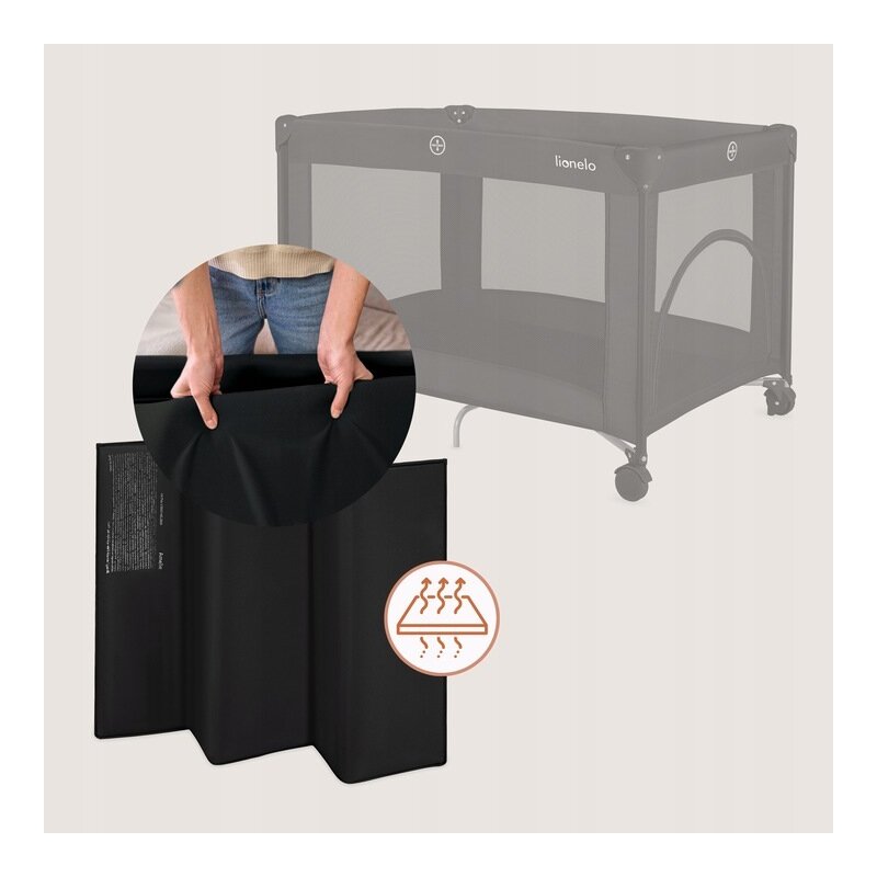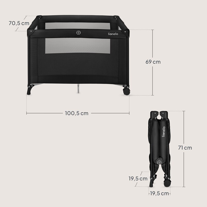 Patutul Lionelo Amelie se pliaza usor, iar odata pliat ocupa foarte putin spatiu – aproximativ 19,5 x 19,5 x 71 cm. Poate fi depozitat simplu in dulap, in portbagaj sau intr-un colt al camerei.