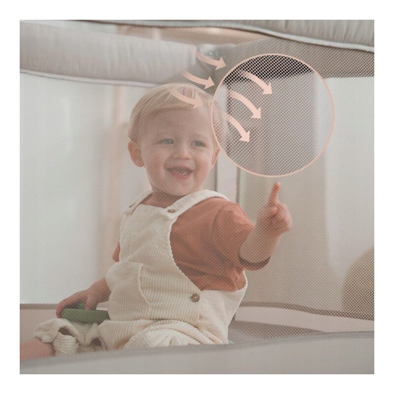 Toate laturile patutului sunt realizate din plasa respirabila, care asigura circulatia optima a aerului si permite parintelui sa supravegheze copilul in orice moment.
