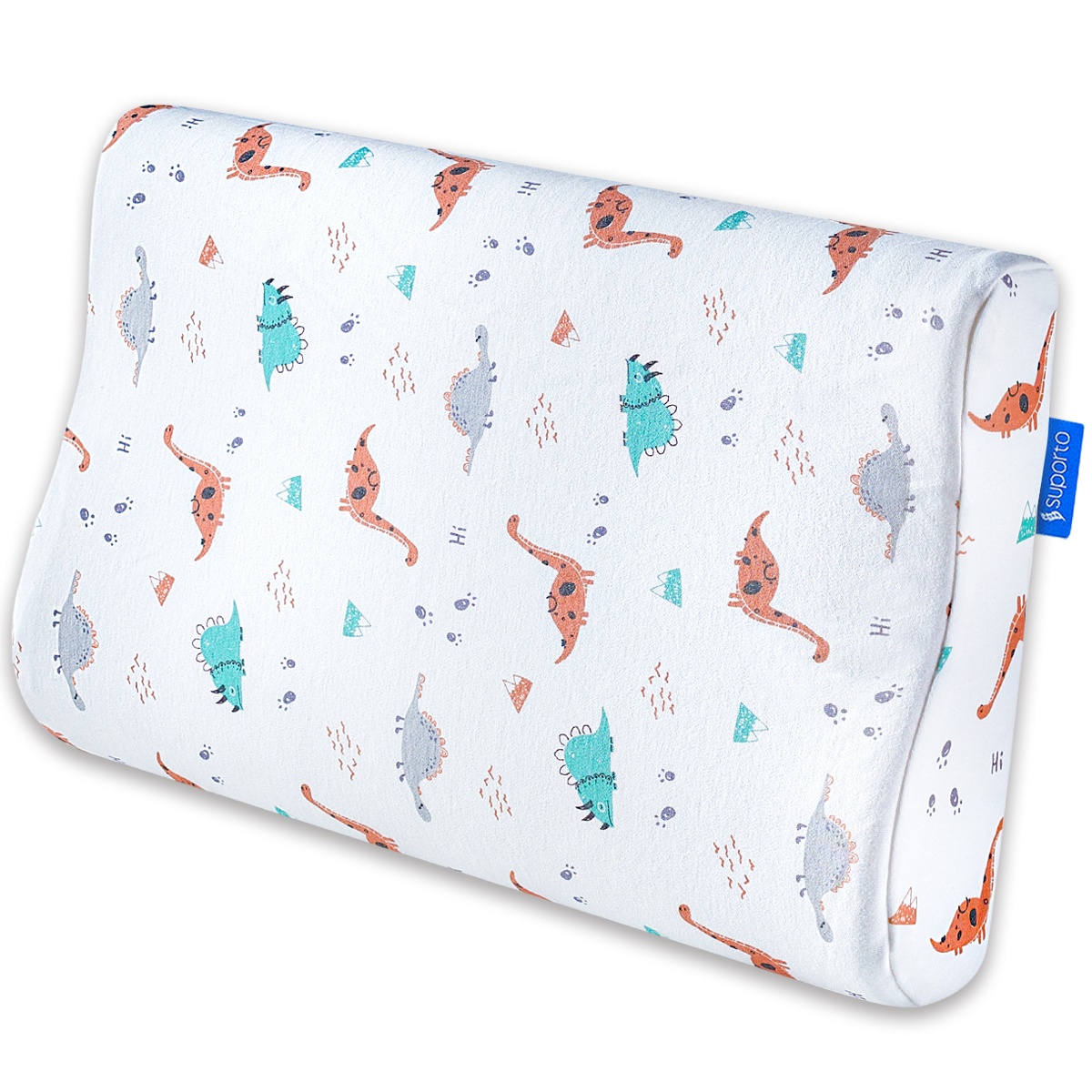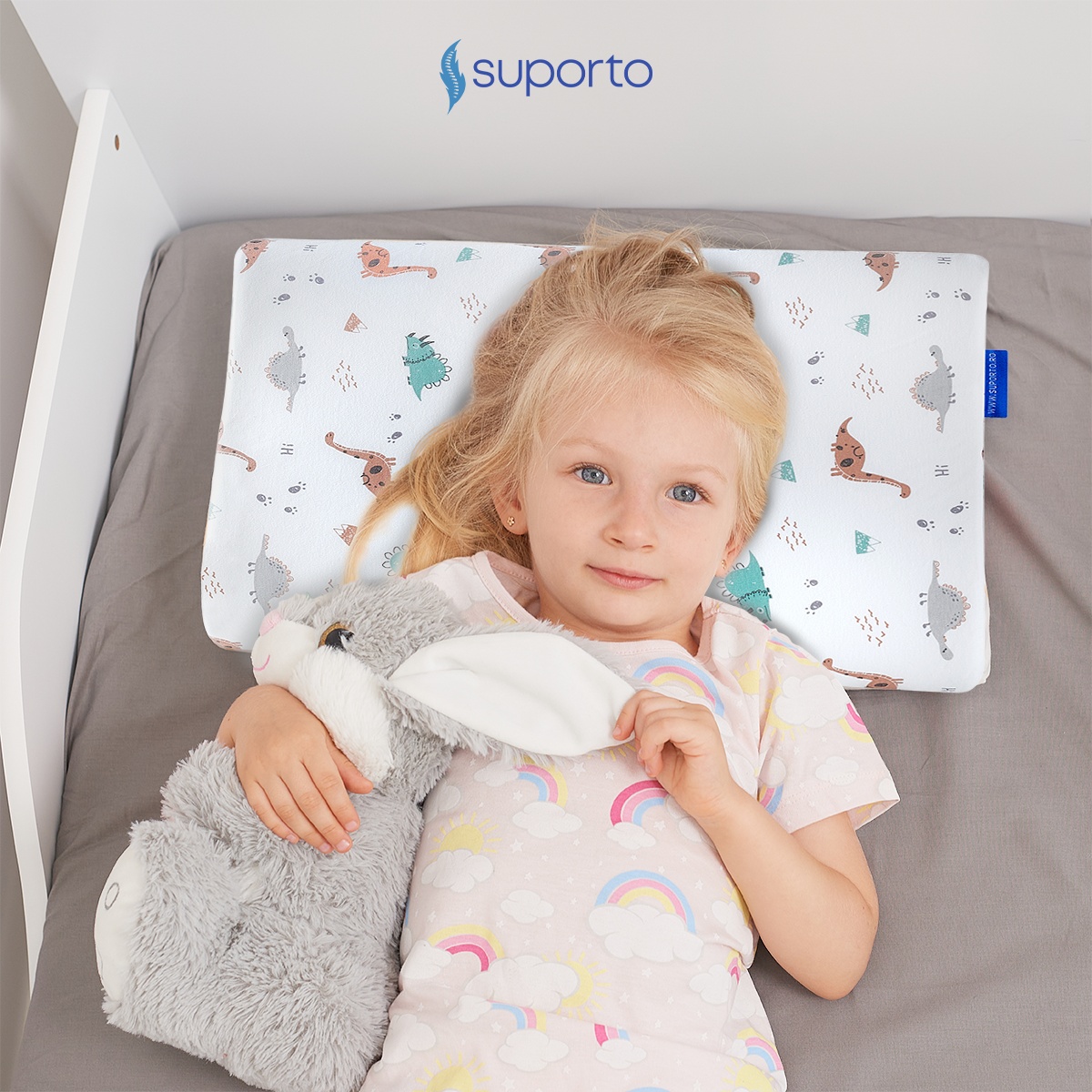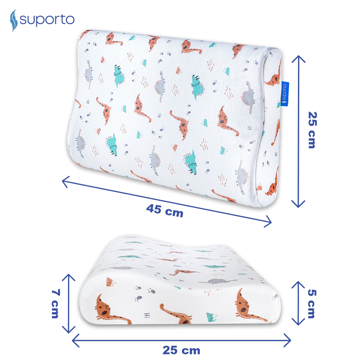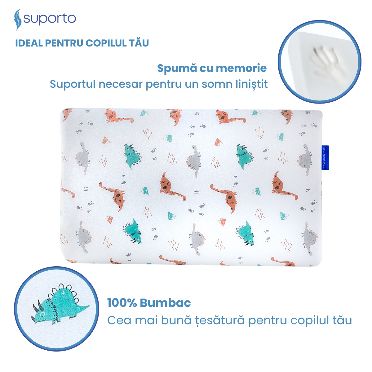 • Perna copii Suporto Toddler, 2 - 9 ani, Ortopedica si Hipoalergenica din Spuma cu Memorie, 2 Inaltimi pentru dormit si Suport cervical, Husa Bumbac 100%, Alba, Model Dinozauri SPTPCO4