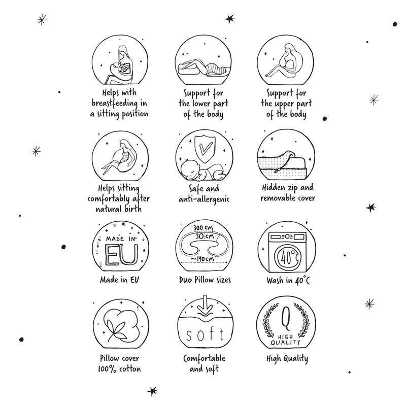 Pernuta este multifunctionala si este dedicata mamicilor care isi doresc maximum de confort si sustinere. Este cea mai mare perna pentru gravide si mame care alapteaza, remarcandu-se printr-o constructie inovatoare in doua parti si utilizarea a doua tipuri diferite de umplutura.
