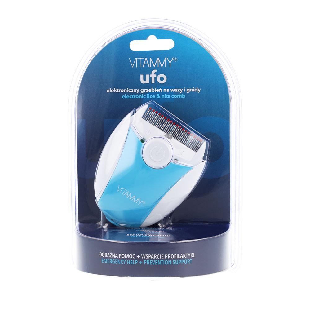 Pieptene electric cu LED Vitammy Ufo, exterminator de paduchi, Albastru Caracteristici: - Pieptene electric; - Eficient; - Sigur; - Fara substante chimice; - Led care lumineaza pielea. Scapati de paduchi in siguranta si eficient, in timp ce va periati parul Spre deosebire de substantele chimice, pieptenele electric Vitammy Ufo nu are miros neplacut, nu provoaca alergii si nu irita pielea. Vitammy Ufo ucide paduchii adulti cu o mica sarcina electrica, complet sigura pentru oameni. Usor de utilizat, cu un LED stralucitor care te ajuta sa vezi paduchii Pe masura ce piepteni parul uscat al capului, pieptenele electric Vitammy Ufo trimite o mica sarcina electrica dintilor metalici ai pieptenului. In momentul in care pieptenele intra in contact cu un paduchi adult, sarcina electrica omoara paduchii. Lampa de portocalie de detectare a paduchilor se va aprinde atunci cand un paduchi este detectat, ucis si prins in pieptene. Indepartati paduchii morti (lampa se stinge) si continuati sa va pieptanati. Pieptenele electric Vitammy Ufo ajuta la indepartarea lindinilor, dar nu omoara ouale. Inainte de folosire: - Parul trebuie sa fie uscat inainte de a utiliza Vitammy Ufo ; - Pieptenele nu trebuie folosit impreuna cu sampoane sau orice alt tip de substanta care neutralizeaza paduchii; - Pentru cele mai bune rezultate, parul trebuie sa fie curat si sa nu fie acoperit cu niciun produs de coafat, cum ar fi gelul sau spuma de par; - Pieptana-ti parul cu un pieptene sau o perie obisnuita, astfel incat parul sa nu se incurce. Se recomanda utilizarea pieptenului electric Vitammy Ufo la fiecare 2-3 zile timp de 16 zile pentru a te asigura ca toti paduchii au fost eliminati.,87 x 60 x 37 mm