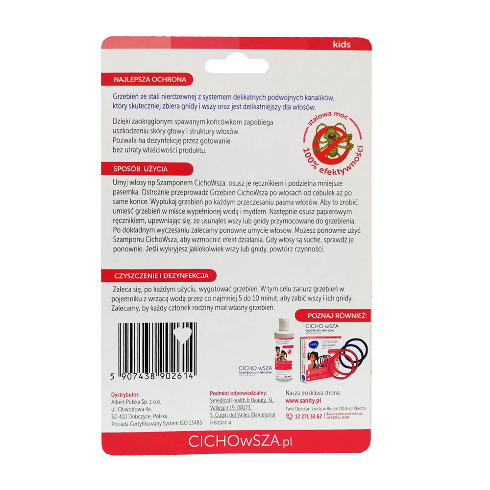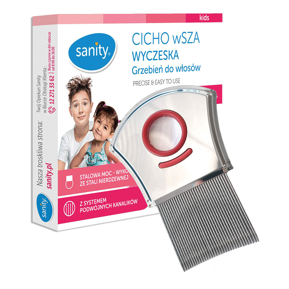 Pieptenele Sanity Cicho wSZA este din otel inoxidabil, capetele fiind sudate la maner si varfurile rotunjite astfel incat sa nu deterioreze scalpul si structura parului. Fiiind din otel, poate fi dezinfectat foarte usor prin fierbere. Manerul este antiderapant si poate fi tinut cu usurinta fara ca sa alunece din mana. Acest produs este foarte eficient daca este folosit impreuna cu sampoanele special concepute pentru indepartarea paduchilor. Spalati parul cu samponul special, uscati-l cu un prosop si impartiti parul in suvite mici. Pieptanati usor si cu grija de la nivelul scalpului pana la varful parului. Clatiti pieptenele dupa fiecare utilizare si stergeti-l cu un prosop de hartie asigurandu-va ca nu a ramas nimic pe el. Dupa ce pieptanati parul va recomandam sa va spalati iar parul. Verificati parul, iar daca au mai ramas paduchi, repetati din nou pasii. Se recomanda sa fierbeti pieptenele dupa fiecare utilizare, timp de 5 - 10 minute. SPECIFICATII: Varsta: + 0 luni Material: Inox Lungime: 9.25 cm Latime: 7 cm,