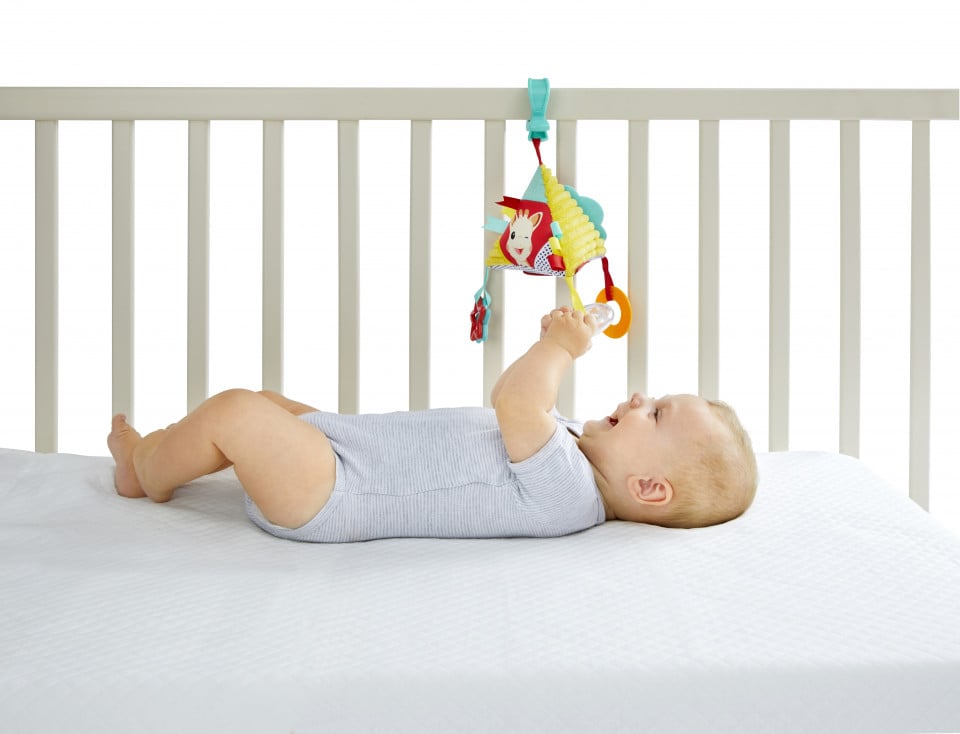Piramida suspendata cu mai mult de 6 activitati pentru a trezi simturile bebelusului. Bebelusul poate descoperi: culori stralucitoare si contrastante hartie mototolita texturi moi si variate (catifea, micro catifea, fetru ) inel de dinti masticabil zornaitoare oglinda Practic, un carlig permite piramidei sa fie suspendata la multe suporturi (bare de pat, manerul masinii...etc). Intretinere: suprafata lavabila