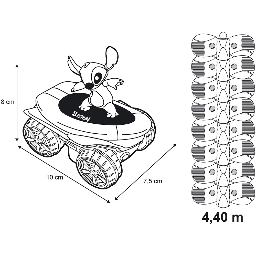 - Setul contine o pista de 4,4 metri (184 piese), 1 vehicul Stitch luminos, 1 clema de fixare si 1 zona de pornire