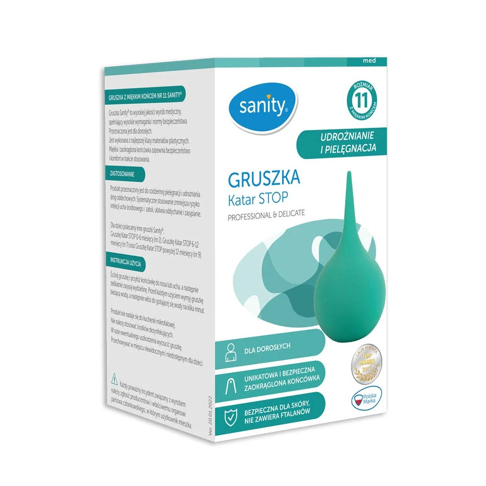 Pompa piriforma Sanity Stop nr.11, nas si urechi, pentru adulti, Verde Pompa Piriforma Sanity Stop nr. 11 - Tratament rapid si usor pentru respiratie curata Pompa Piriforma Sanity Stop nr. 11 este un dispozitiv medical de inalta calitate, creat pentru a oferi o modalitate rapida si usoara de a trata problemele respiratorii, fara disconfort sau durere. Un dispozitiv de incredere: Pompa Piriforma Sanity Stop este destinata adultilor si vine cu toate garantiile de siguranta si calitate. Fabricata din materiale plastice de cea mai buna calitate si fara ftalati, aceasta pompa este sigura si eficienta. Siguranta si confort intr-un singur dispozitiv: Unul dintre punctele forte ale Pompei Piriforme Sanity Stop este varful sau moale si rotunjit, care asigura atat siguranta, cat si confortul in timpul utilizarii. Beneficii ale utilizarii Pompei Piriforme Sanity Stop: - Respiratie Curata: Pompa este destinata ingrijirii zilnice si deblocarii cailor respiratorii, reducand riscul de infectii ale urechii medii si sinusurilor si facilitand respiratia; - Versatilitate in Utilizare: Aceasta pompa ofera doua moduri de utilizare - uscat (aspirare) pentru curatarea nasului de secretiile care curg si a urechilor de apa si ceara si umed (irigare) pentru curatarea nasului. Instructiuni: - Strangeti pompa si plasati varful in nasul sau in urechea copilului, apoi aspirati usor secretia; - Inainte de fiecare utilizare, spalati pompa cu apa curenta si apoi puneti-o in apa clocotita pentru cateva minute; - Pentru a mentine integritatea produsului, nu este potrivit pentru cuptorul cu microunde; - Evitati dezinfectantii si orice substante agresive; - In caz de deteriorare, aruncati produsul. Atentie la siguranta copiilor: Nu lasati produsul la indemana copiilor, pentru a preveni orice utilizare nepotrivita. Pompa Piriforma Sanity Stop nr. 11 este raspunsul tau la ingrijirea eficienta si sigura a cailor respiratorii.,
