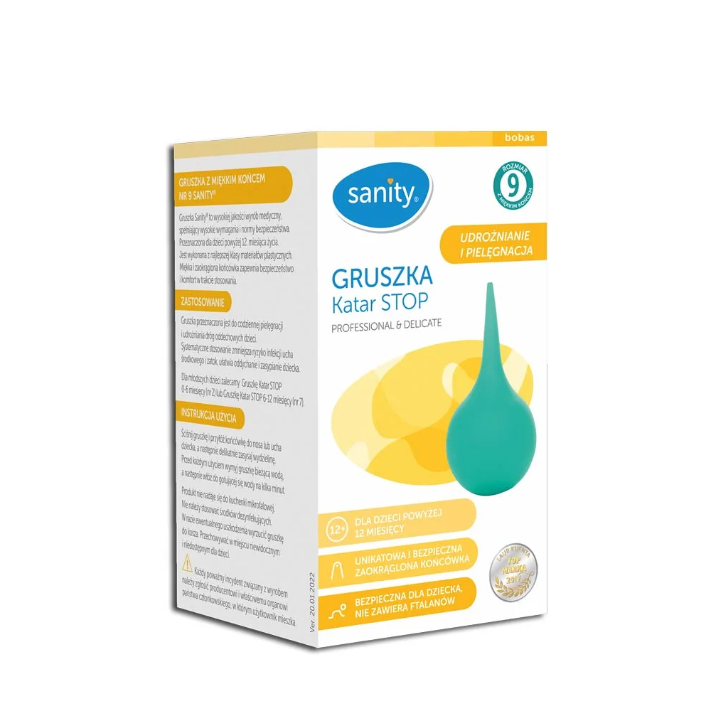 Ultima actualizare a informațiilor de prezentare pentru Pompa piriforma Sanity Stop nr.9, nas si urechi, pentru copii 1 an+, Verde BITpompaSanityStop9 a fost efectuată la data de 23.04.2026