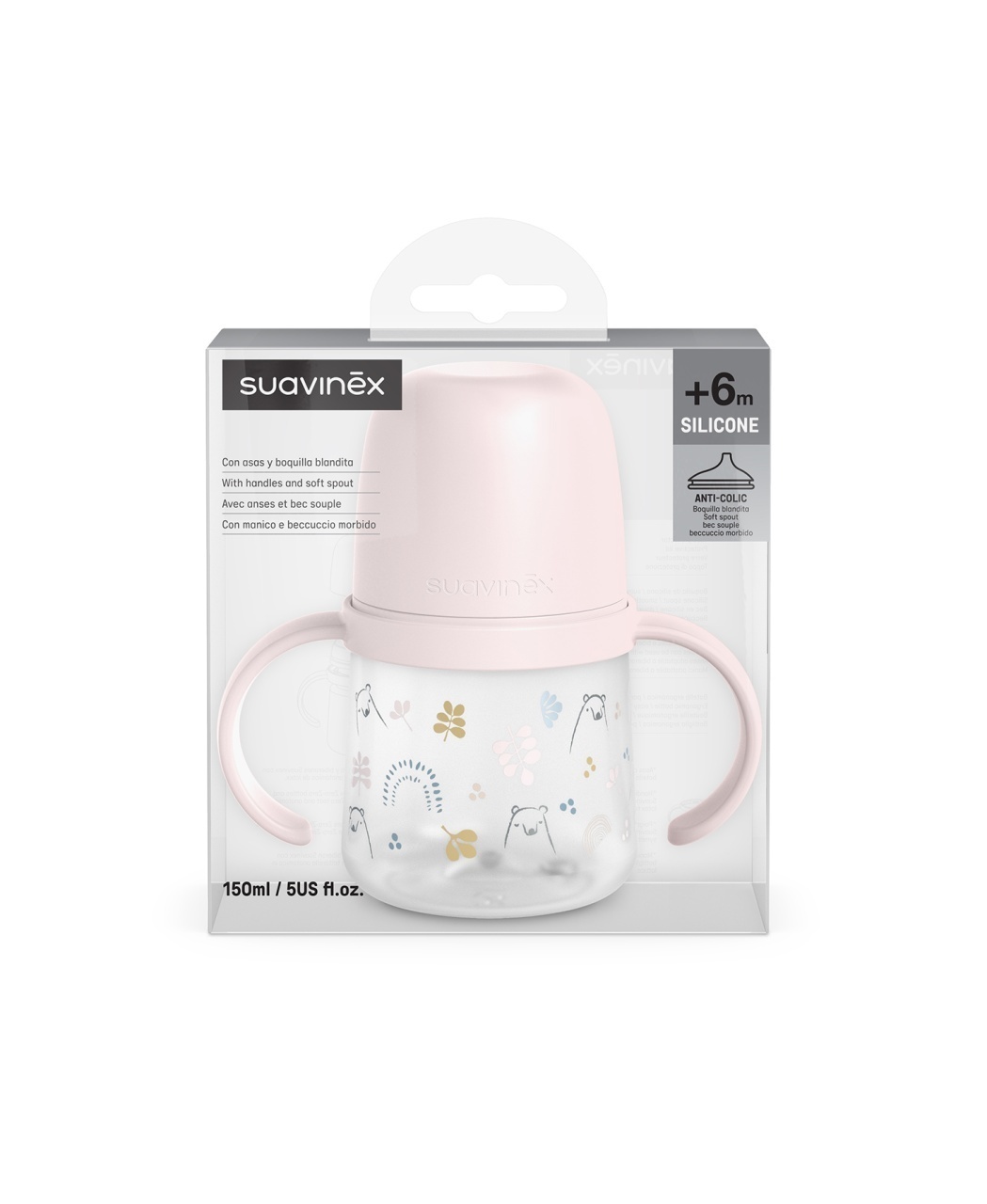 Muștiucul moale din silicon este delicat cu gingiile sensibile ale bebelușului, oferind o tranziție lină de la tetină, fără disconfort. Mânerele laterale oferă stabilitate, iar capacul de protecție menține muștiucul curat atunci când cana nu este folosită. Inelul filetat este compatibil cu toate biberoanele Suavinex (cu excepția gamelor Zero), ceea ce permite adaptarea ușoară la preferințele copilului.