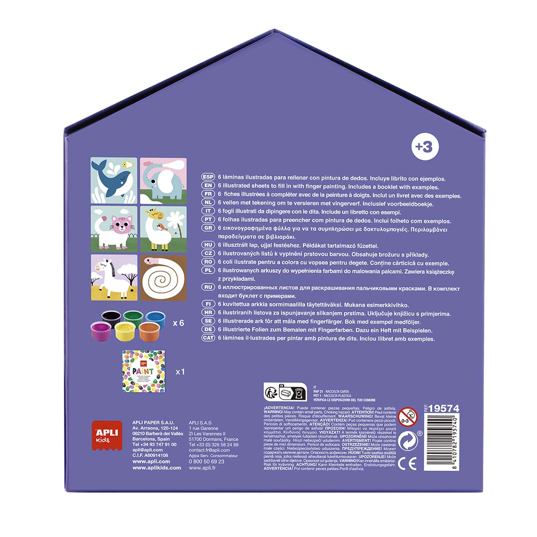 Include 6 coli cu tematica animala, 6 cutii de pictura pentru degete si 1 carte cu instructiuni si exemple despre cum se realizeaza activitatea.