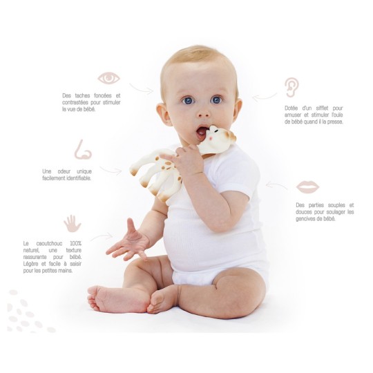 Sacosa Cadou Din Bumbac contine girafa Sophie (18 cm), zornaitoare (12 cm) si inel de dentitie cu aroma de vanilie (8 cm).
