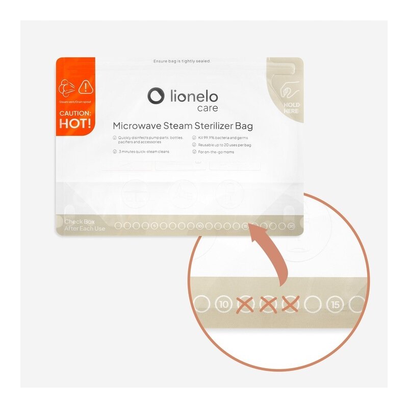 Lionelo Thermbag este solutia rapida, sigura si igienica pentru sterilizarea accesoriilor bebelusului. In doar 90 de secunde, suzetele, biberoanele sau componentele pompei de san sunt din nou curate si gata de utilizare. Pungile sunt rezistente la temperaturi inalte, pot fi refolosite de pana la 20 de ori si elimina pana la 99,9% dintre bacterii. Ideale pentru acasa si pentru calatorii.