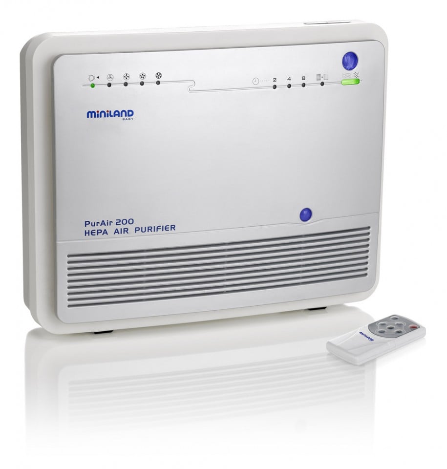 Aparat pentru purificarea si ionizarea aerului Baby Pur de la Miniland. Printre avantajele utilizarii unui astfel de aparat, se enumara reducerea riscului aparitiei alergiilor si ale astmului, eliminarea mirosurilor neplacute si ionizarea aerului.   Prin utilizarea acestui aparat de purificare a aerului, se reducer riscul aparitiei alergiilor si ale astmului. Minimalizarea riscului (in special la copii) de a suferi de probleme virale. Elimina mirosurile neplacute din aer. Reduce congestiile nazale si hidrateaza gatul copilului. Reduce aparitia durerilor de cap cauzate de problemele respiratorii, astm sau alergii. O data cu utilizarea acestui aparat, somnul devine mai linistit si mai odihnitor. Functie de ionizare a aerului. Imbunatateste calitatea aerului ca urmare a eliminarii in aer a ionilor negativi (happy ions) in atmosfera. Emite ioni negativi dupa 30 de minute de la pornire. Aparatul poate fi programat sa porneasca / opreasca (2, 4 si 8 ore). Semnal luminos (led) care isi modifica culoarea in functie de puritatea detectata a aerului (verde – aer curat; portocaliu – aer usor poluat; rosu – aer poluat). Modificarea automata a ventilatorului, in functie de puritatea detectata a aerului. Extrem de eficient pentru incaperi cu suprafata de maxim 50 mp. Purificarea aerului se realizeaza cu ajutorul a 5 filtre diferite:          Pre filtru impotriva scrumului de tigara, impuritati, praf, fum si par de animale. Cu tehnologie Intersept antiseptic.          Filtru activ de carbon impotriva gazelor si mirosurilor. Cu tehnologie Intersept antiseptic.          Flitru HEPA impotriva particulelor, alergenilor.          Fotocatalizator.          Filtru care elimina ioni negativi, benefici organismului. Cu lumina UV duala impotriva bacteriilor si virusilor. Este prevazut cu telecomanda pentru ajustarea rapida si comoda a functiilor aparatului. Se pot achizitiona separat: Pre filtru cod 89044 Filtru carbon cod 89045 Filtru HEPA cod 89046 Caracteristici tehnice: Voltaj: 220 - 240 V, 50 Hz Zgomot: