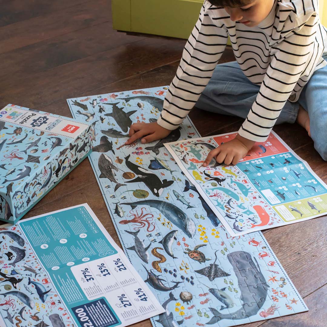 Puzzle cu animale oceanice pe cale de disparitie pentru a identifica speciile pe cale de disparitie si a creste gradul de constientizare in randul copiilor cu privire la importanta protejarii ecosistemului. Include 200 de piese cu dimensiunile de 6 x 3 cm si doua cartonase cu informatii despre speciile pe cale de disparitie si motivele situatiei lor in 16 limbi diferite. Odata ce puzzle-ul este completat, copiii vor invata despre lumea marina. Puzzle-ul masoara 100 x 30 cm. Puzzle-urile ajuta la imbunatatirea si dezvoltarea unei multitudini de abilitati si capacitati: imbunatatesc concentrarea, observarea, memoria si rezolvarea problemelor; si dezvolta constientizarea spatiala, abilitatile motorii fine si coordonarea mana-ochi. Recomandat copiilor cu varsta de 6 ani si peste.