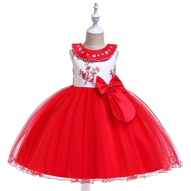 Rochie eleganta din saten alb in partea de sus pe care este aplicat tul cu floricele brodate si din tul rosu in partea de jos. Are guleras din saten rosu pe care sunt aplicate perlute, iar in talie are o funda din saten. Se inchide cu fermoar si cordon la spate.