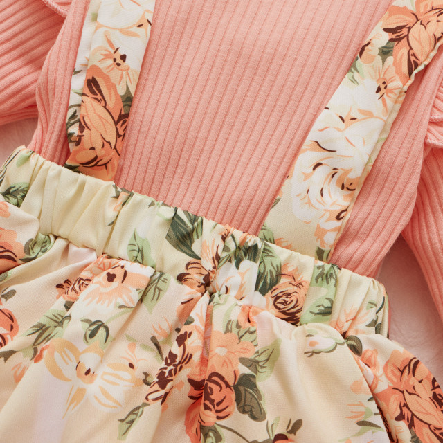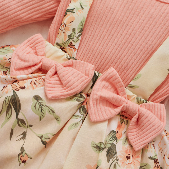 - Rochita body roz, cu manecute lungi, cu sarafan ivoire, imprimat cu floricele aplicat. Se inchide cu capse intre picioruse.