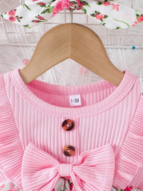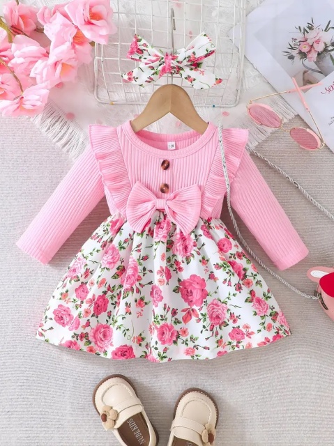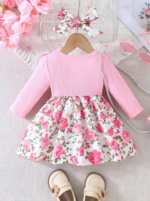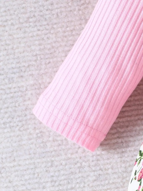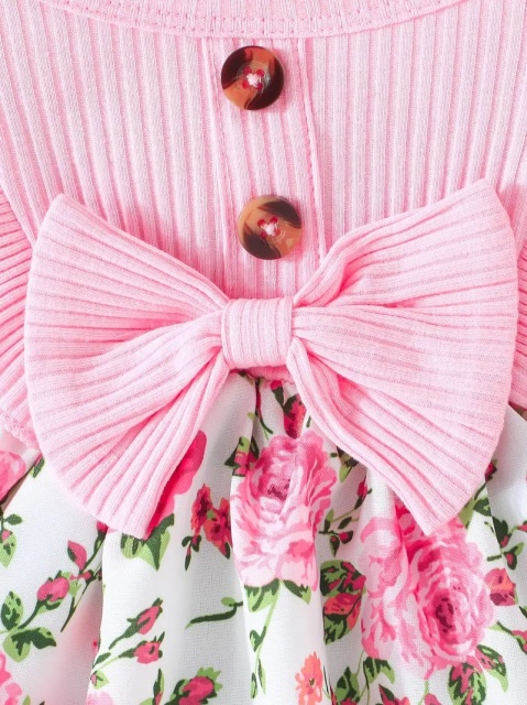 Cu un design delicat si feminin, rochia are un top roz cu maneci lungi si volanase decorative, completat de doi nasturi eleganti in partea din fata.