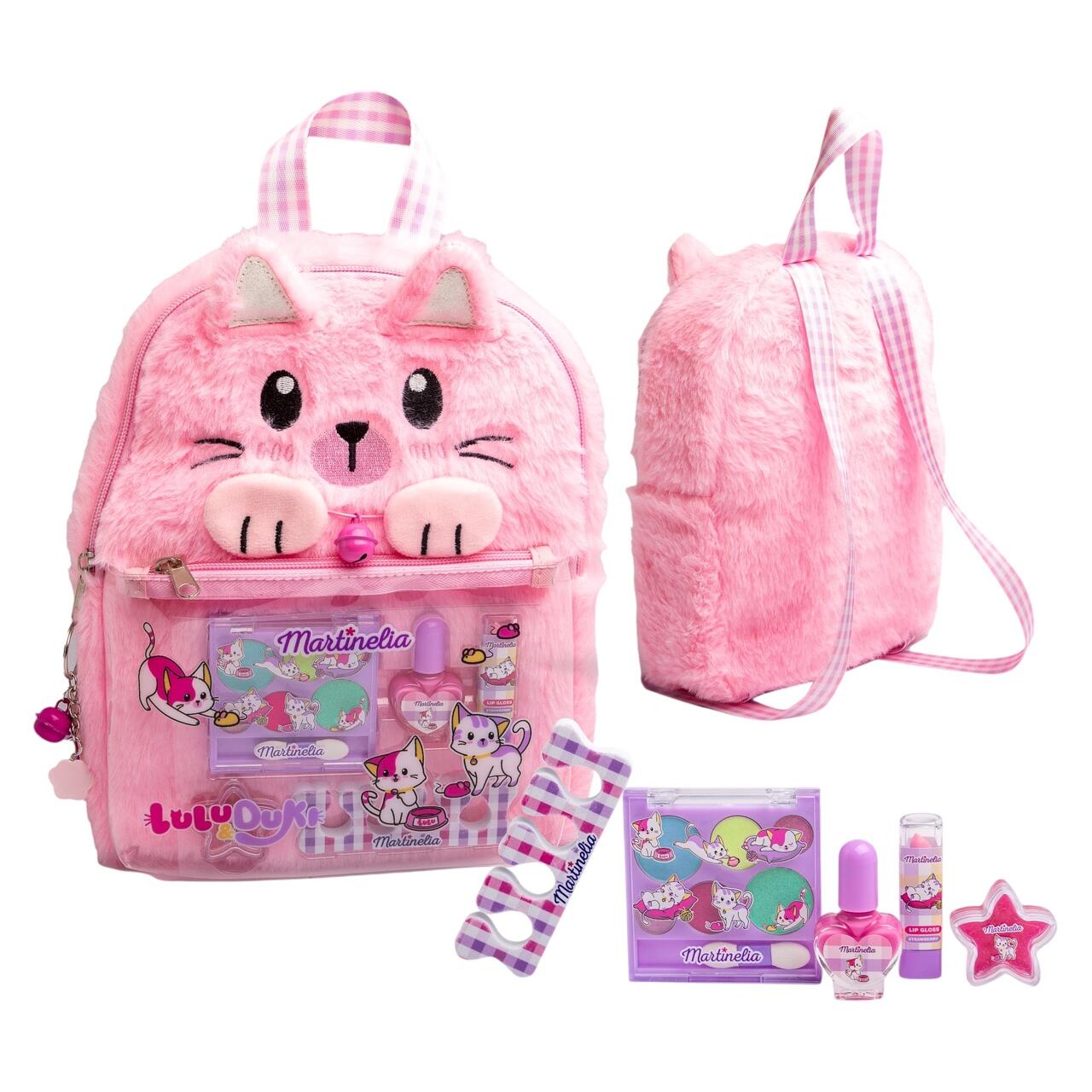 Descoperă bucuria machiajului jucăuș cu Rucsacul Lulu & Duki de la Martinelia! Acest set adorabil este perfect pentru micile iubitoare de pisicuțe și culoare, combinând distracția și creativitatea într-un format practic și plin de farmec. Rucsacul pufos, moale și confortabil ascunde în interior o selecție de produse cosmetice sigure pentru copii, ideale pentru joacă și pentru primele explorări de frumusețe.