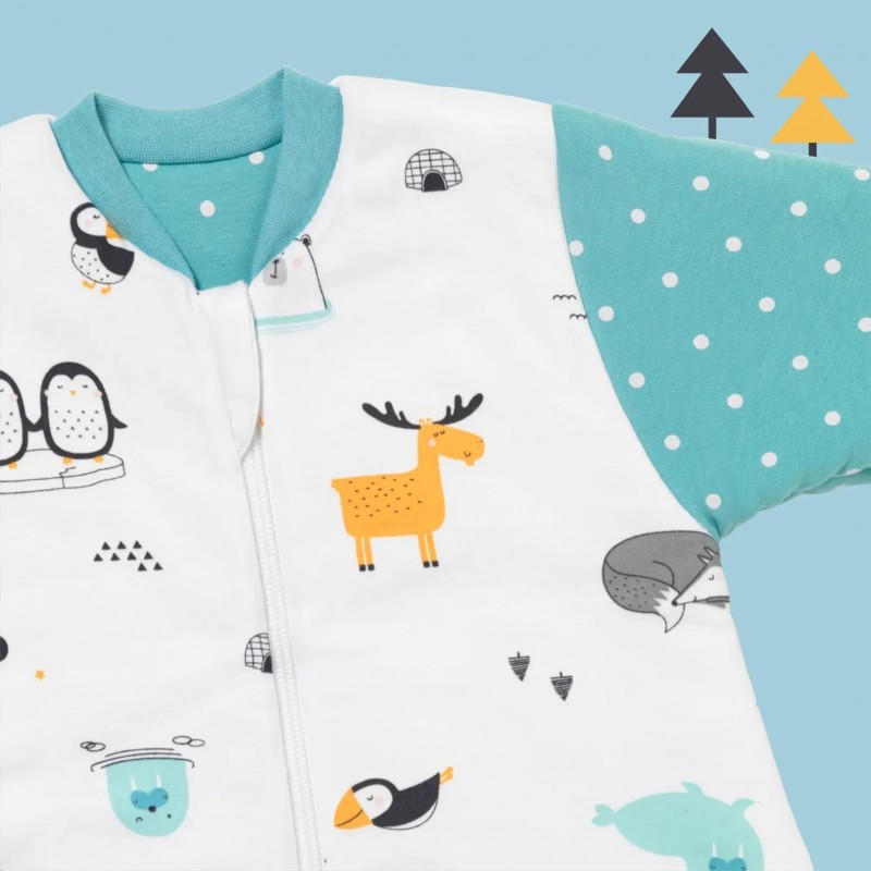- In partea din fata produsul este prevazut cu fermoar, fapt care permite copilului sa fie asezat cu usurinta in sacul de dormit