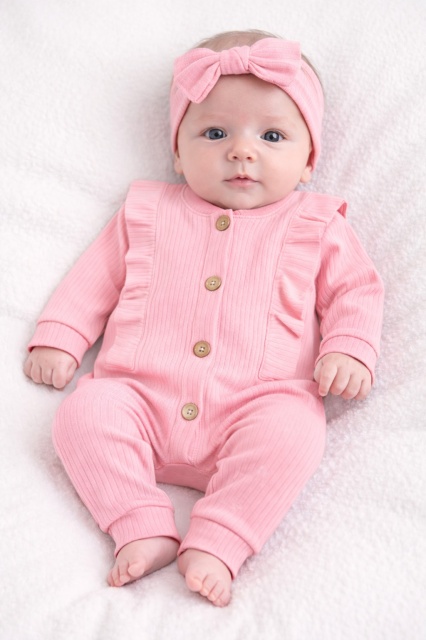 Acest produs Salopeta bebe fetite bumbac rib cu volanase si bentita set roz este model TRAM0037