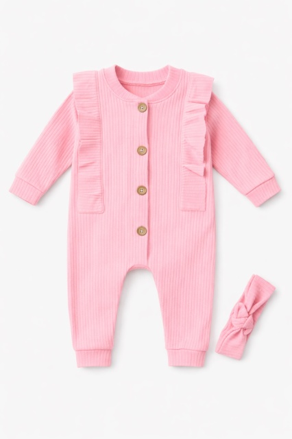 Acest produs Salopeta bebe fetite bumbac rib cu volanase si bentita set roz este model TRAM0037